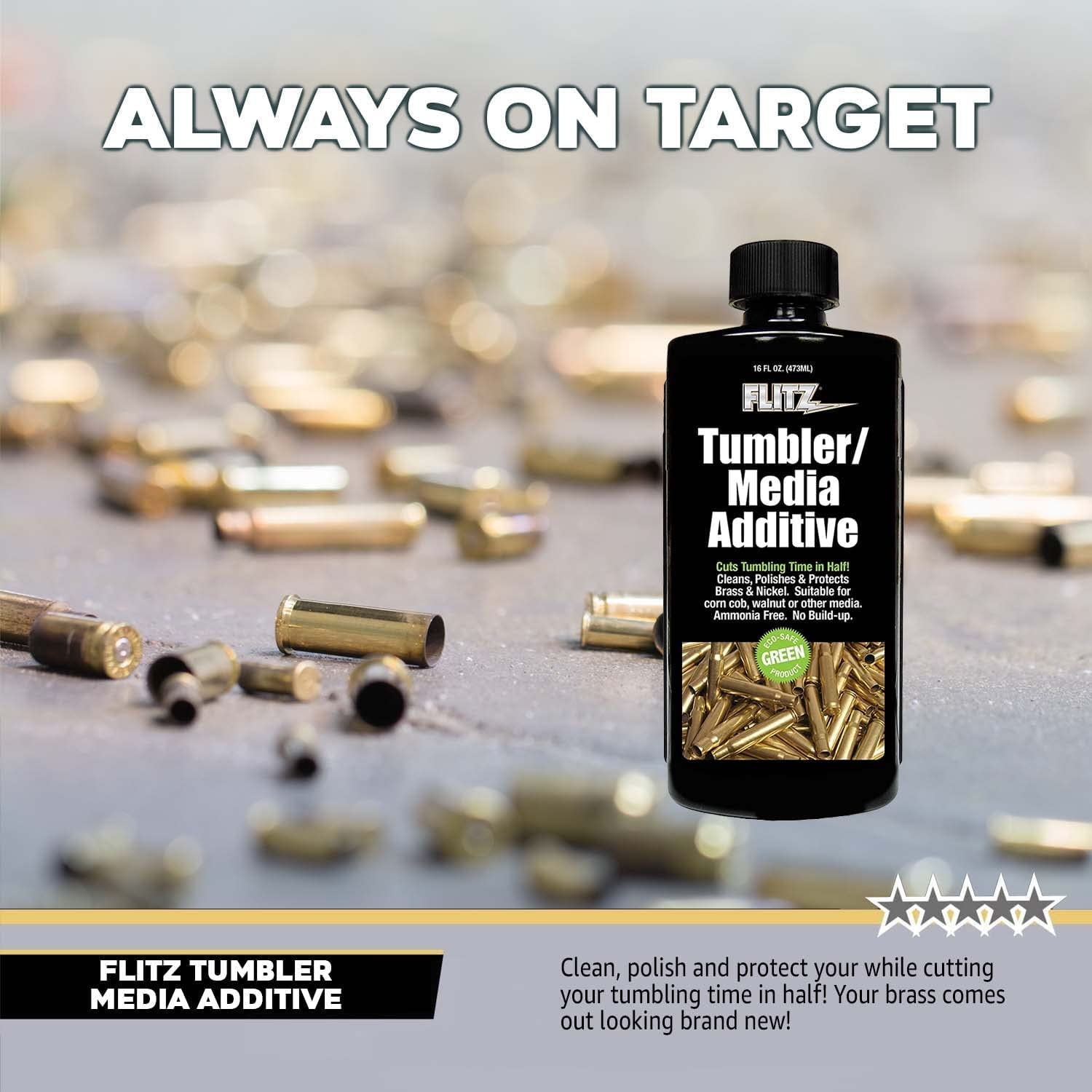 Safe On All Metals: This tumbler media additive is safe to use on any metal. Our proprietary formula is non-ammonia based and it will not deaden primer or stress and embrittle brass. Cut Tumbling Time In Half: Speed up your tumbling time and still get the best possible results. Flitz Tumbler Media Additive is the safe and effective way save time without sacrificing results. Easy To Use: Simply pour in 1 ounce per 1 pound of your favorite media and then let our specially blended formula go to work. Easily Removes: Flitz Tumbler Media Additive easily removes oxidation, tarnish, lead buildup, and fingerprints. Made In The USA: This Tumbler Media Additive is developed in Germany with advanced German ingredients and proudly made at our headquarters in Wisconsin. Flitz is a 45-year-old family-owned company.Tough metal requires tough cleaning. Supercharge your media’s scrubbing power with Flitz Tumbler Media Additive!