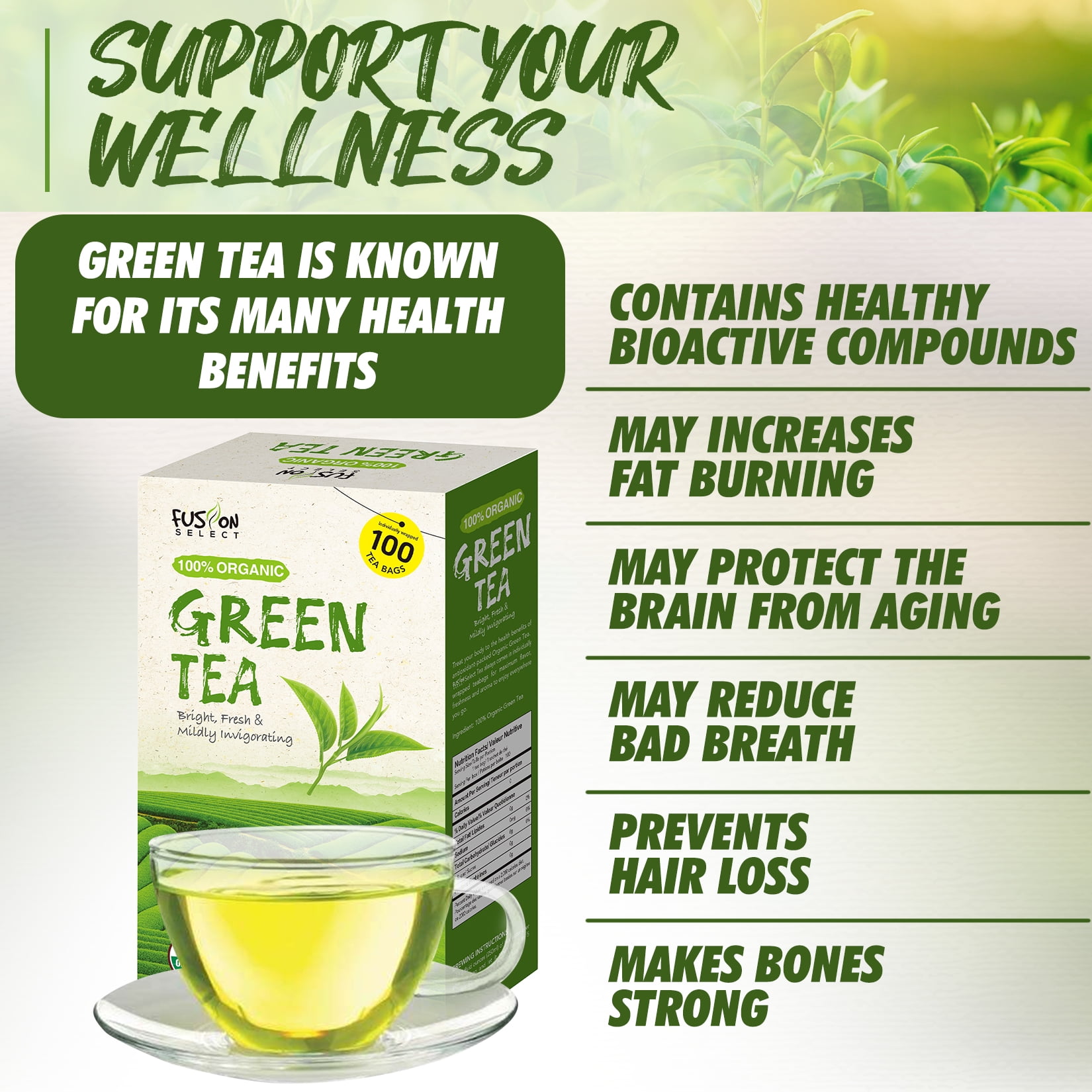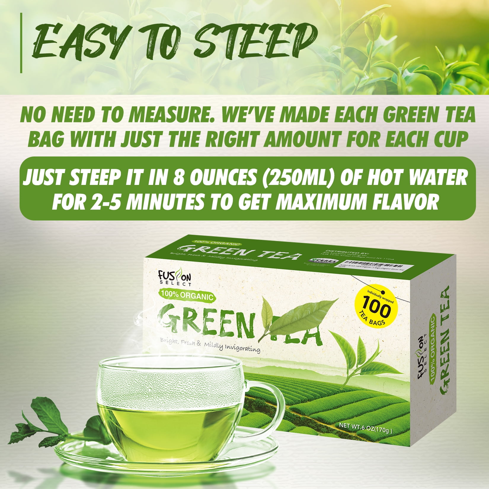 Fusion Select 100% Organic Green Tea 100 Individually Wrapped Tea Bags Drink with Mild & Bright Flavor Relaxing Tea Beverages with Antioxidant Support