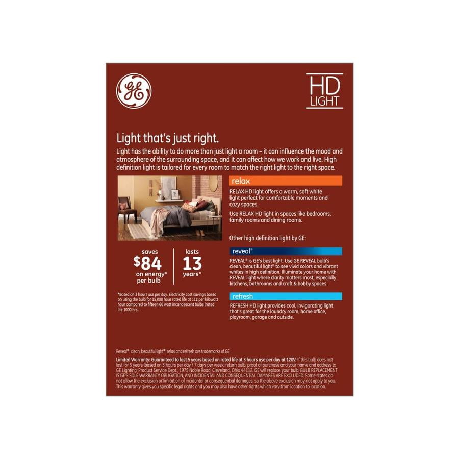 GE Relax HD Soft White LED 60-Watt Replacement light bulbs provide enhanced color contrast and boldness versus standard LED bulbs. The high definition soft white light helps create a comfortable, cozy light that’s ideal for bedroom lighting, foyer lighting, family rooms and dining rooms. They’re dimmable and illuminate your home with soft white light. These are great for frequently used fixtures—GE Relax HD Soft White LED bulbs are rated to last twice as long as GE Basic LED bulbs and save 84 dollars on energy costs over the bulb’s life versus a 60-Watt incandescent bulb. Unlike CFL bulbs, GE LED HD bulbs feature enhanced color, instant full brightness and are free of Mercury. Replace CFL and incandescent light bulbs with GE Relax HD Soft White LED general purpose light bulbs in indoor table lamps, sconces and open fixtures, including damp locations.