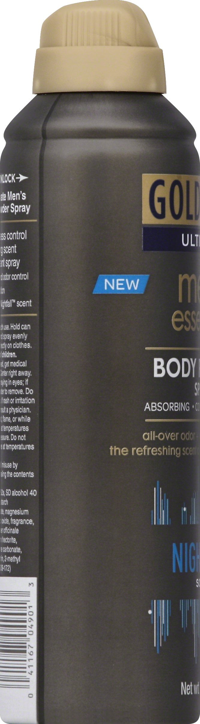Meet irresistible-smelling odor and wetness control in a convenient, no-mess spray bottle. GOLD BOND Ultimate Men’s Essentials Talc-Free Body Powder Spray’s unique triple action formula keeps things feeling fresh while protecting against wetness. Simply point and spray wherever you need to feel refreshed. No loose powder, no mess. Best of all, this body powder for men provides a cooling sensation when you apply it. GOLD BOND Ultimate Body Powder Spray for Men comes in two irresistible scents: Recharge and Nightfall. Try them both to stay fresh and keep things interesting. Stock up on 7-oz. spray bottles of GOLD BOND Ultimate Men’s Essentials Body Powder Spray so you always have that cool, fresh feeling on hand for whenever you need it. Pack one in your gym bag and keep a bottle in your bathroom to use after showering. Now talc-free and formulated without parabens and preservatives. Absorbs odor-causing sweat. DIRECTIONS FOR USE: Shake well before each use. Hold can approximately 6”-8” from the skin and spray evenly for 2-3 seconds. Do not spray directly on clothes.