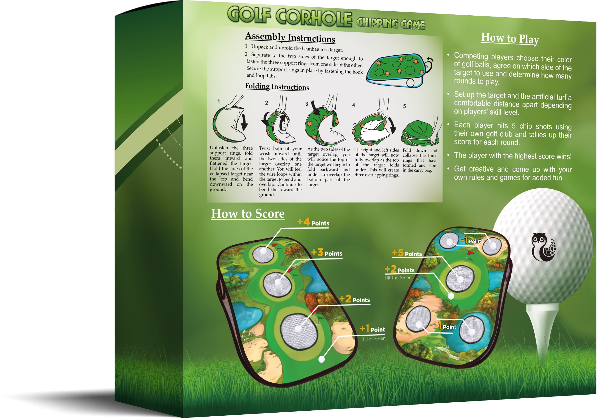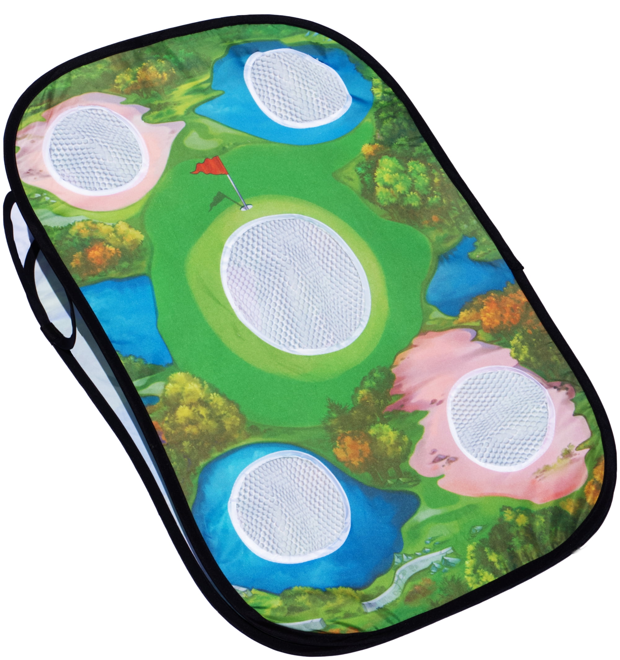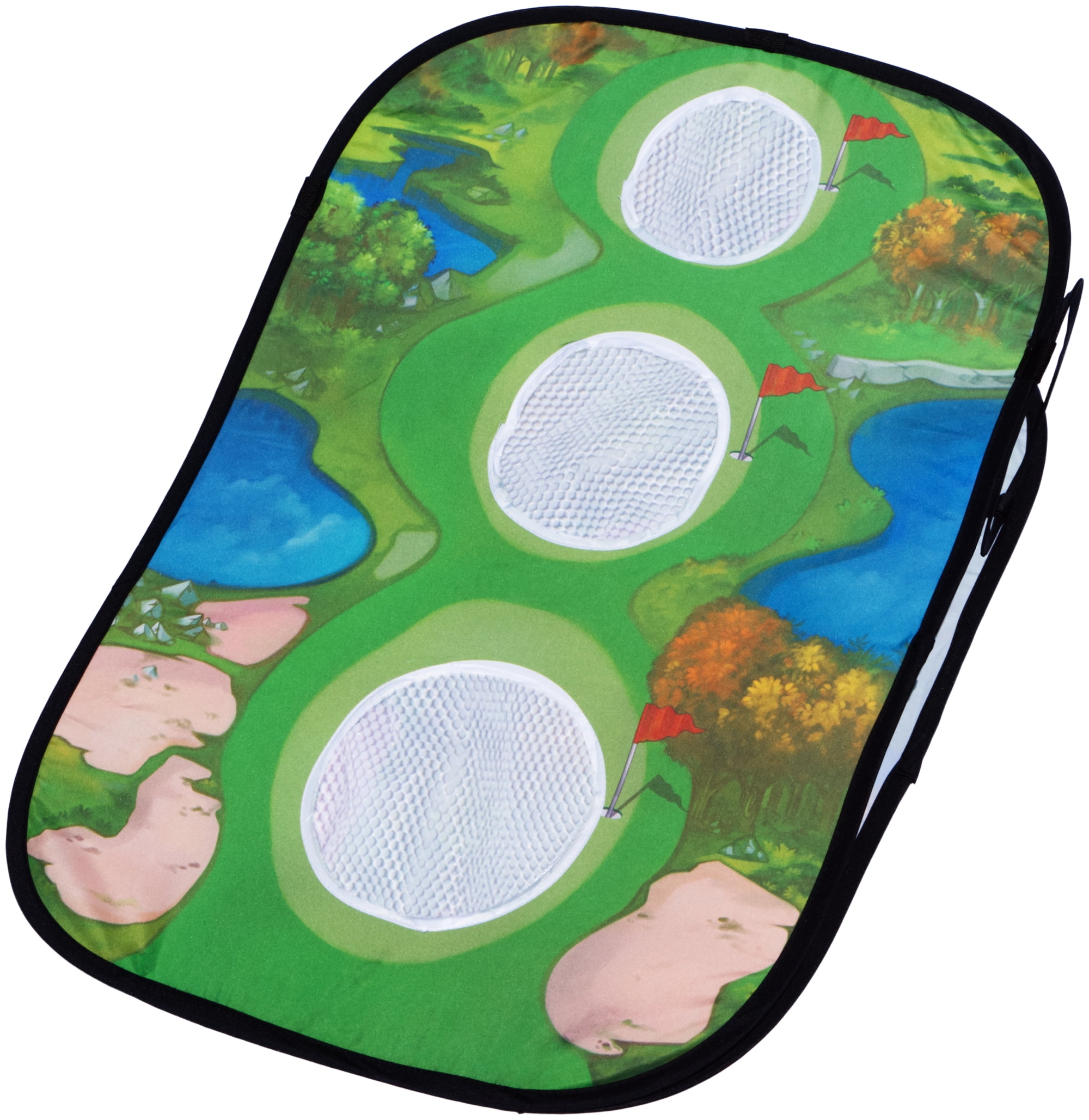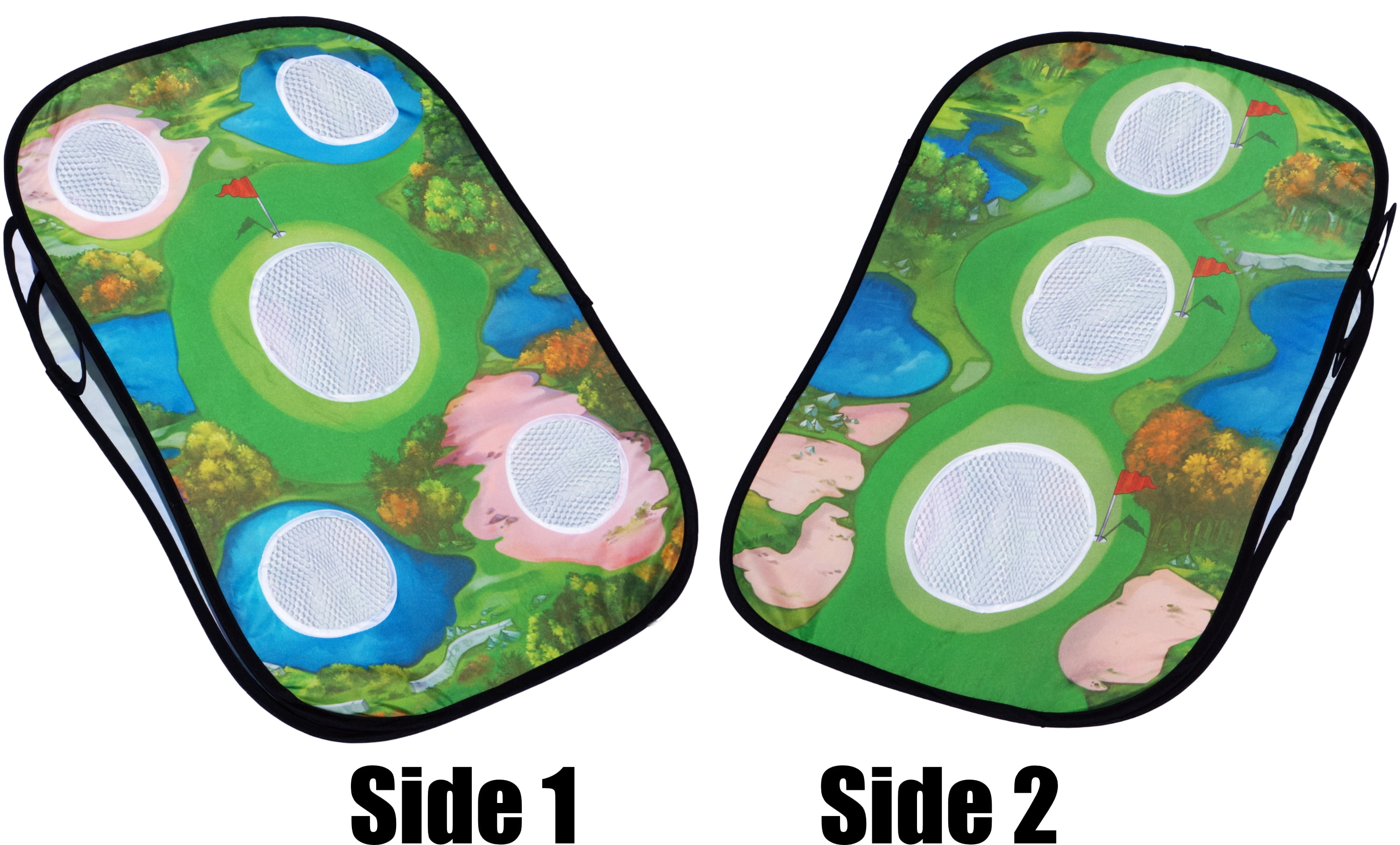 - DOUBLE SIDED: 36" x 24" target features two fun ways to play on the beautifully illustrated golf courses. Includes an artificial turf hitting mat, 8 PU soft training golf balls, anchors and a storage.