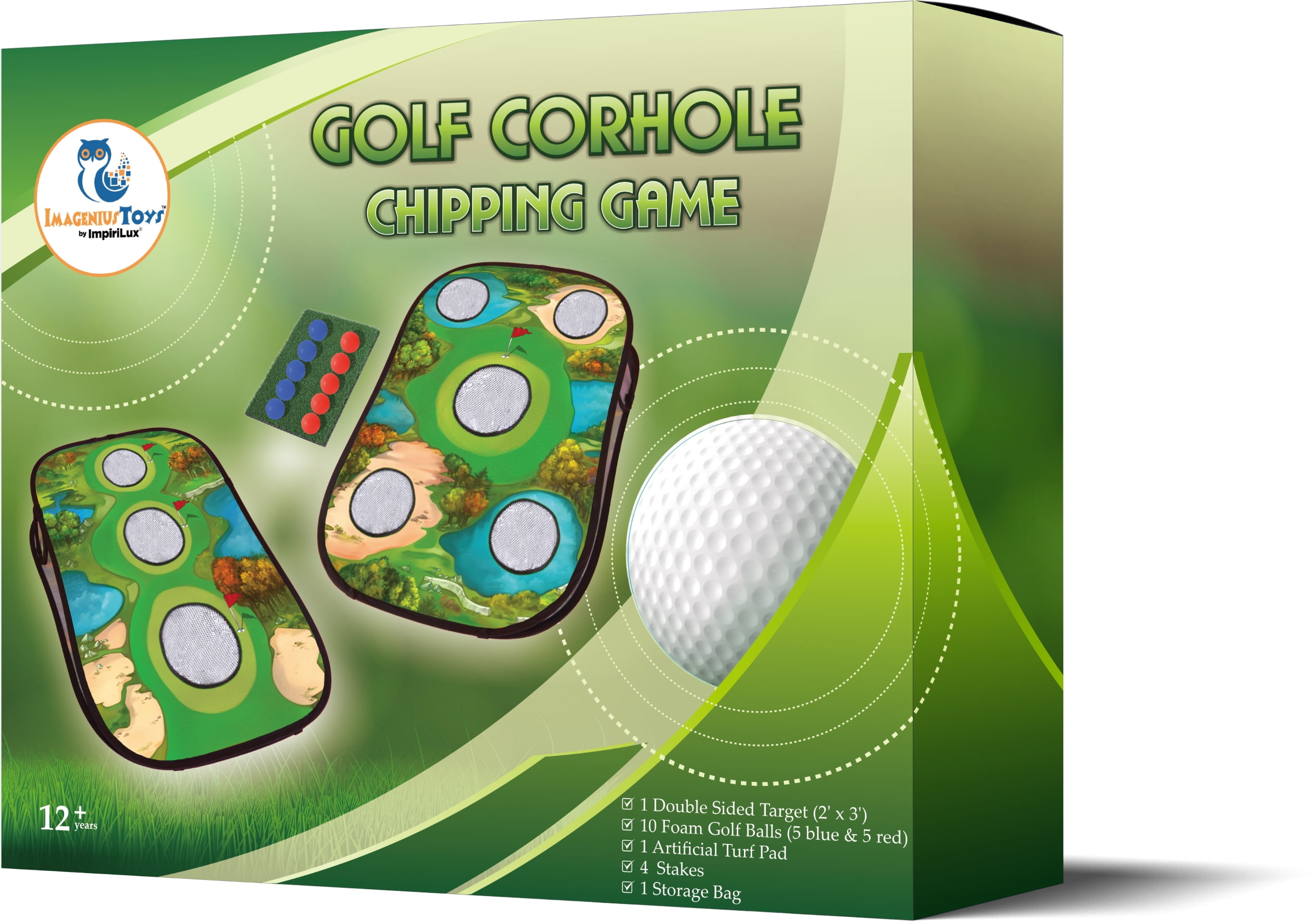 Golfers of all ages will love playing the ImpiriLux Golf Cornhole Chipping Game! The double sided target offers two ways to play. One side features one golf hole to score and three hazards to challenge players. The reverse side provides three different sized golf holes with increasing points as holes get smaller. Soft foam blue and red balls allow two players to compete indoors. The package also includes stakes to secure the target to grass and a storage bag. Makes a great game and gift for golf lovers of all ages.