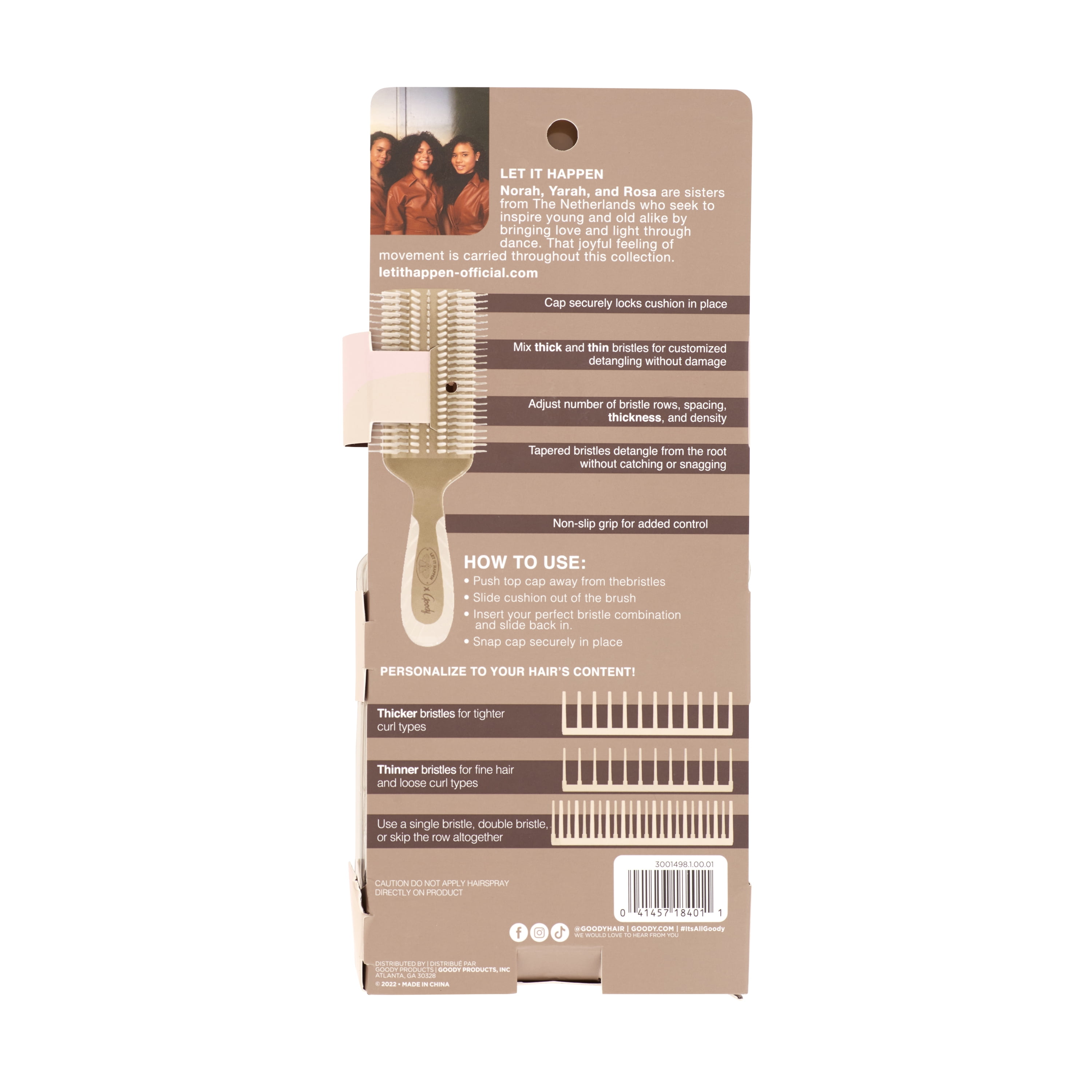 Goody Tru is a creative collaboration that honors the unique vision of some of today’s most compelling multi-cultural artists while also celebrating individuality and self-expression. These artists have come together with the most-loved hair accessory brand in the world to create a unique style narrative that’s all about embracing a brighter, bolder you. Only at Walmart! The Goody Tru x Let It Happen Custom Detangling Brush is great for Ouchless® detangling of all curl types. Adjust the number of bristle rows, spacing, density, and thickness to create the ultimate detangler for you unique curl type. It’s all Goody!Goody Tru X Let It Happen Collab Custom Detangling Brush for Ouchless® Detangling Tan, 1 CT CUSTOM DETANGLING BRUSH HOW TO USE: • Push top cap away from the bristles • Slide cushion out of the brush • Insert your perfect bristle combination and slide back in. • Snap cap securely in place Cap securely locks cushion in place Mix thick and thin bristles for customized detangling Adjust number of bristle rows, spacing, thickness and density Slideproof™ grip for added control CREATE YOUR IDEAL BRISTLE COMBINATION! Thicker bristles for tighter curl types Thinner bristles for fine hair and loose curl types CAUTION: DO NOT APPLY HAIRSPRAY DIRECTLY ON PRODUCT LET IT HAPPEN Norah, Yarah, and Rosa are sisters from The Netherlands who seek to inspire young and old alike by bringing love and light through dance. That feeling of joyful movement is carried throughout this collection. letithappen-official.com