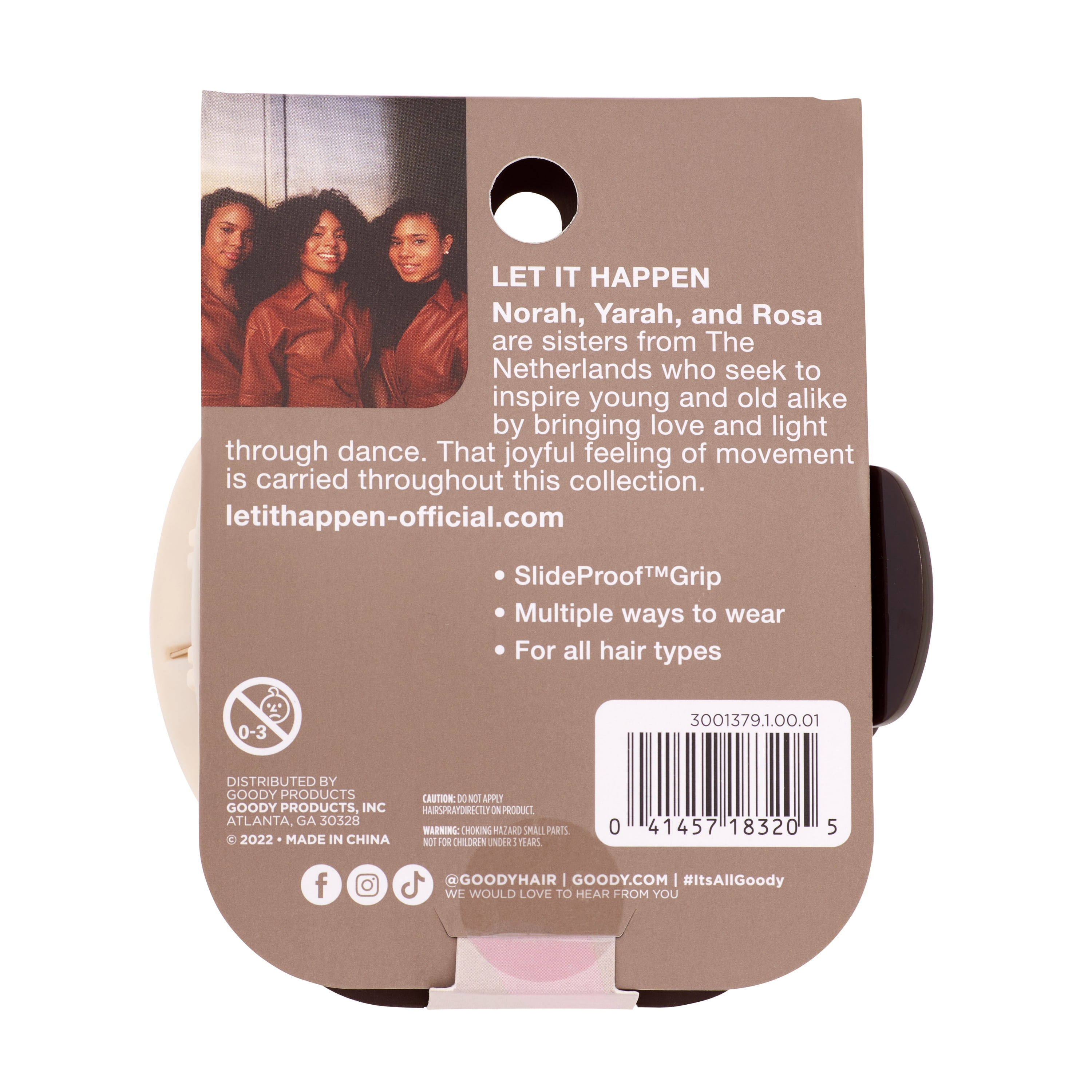 Goody Tru is a creative collaboration that honors the unique vision of some of today’s most compelling multi-cultural artists while also celebrating individuality and self-expression. These artists have come together with the most-loved hair accessory brand in the world to create a unique style narrative that’s all about embracing a brighter, bolder you. Only at Walmart! The Goody Tru x Let It Happen SlideProof™ Medium Claw Clips can be worn multiple ways and feature a soft-touch finish. Ideal for quick and easy styling for all hair types. It’s all Goody!Goody Tru X Let It Happen Slideproof™ Medium Claw Clips Brown, 2 CT SlideProof™Grip Multiple ways to wear For all hair types Exclusively at Walmart! LET IT HAPPEN Norah, Yarah, and Rosa are sisters from The Netherlands who seek to inspire young and old alike by bringing love and light through dance. That feeling of joyful movement is carried throughout this collection. letithappen-official.com