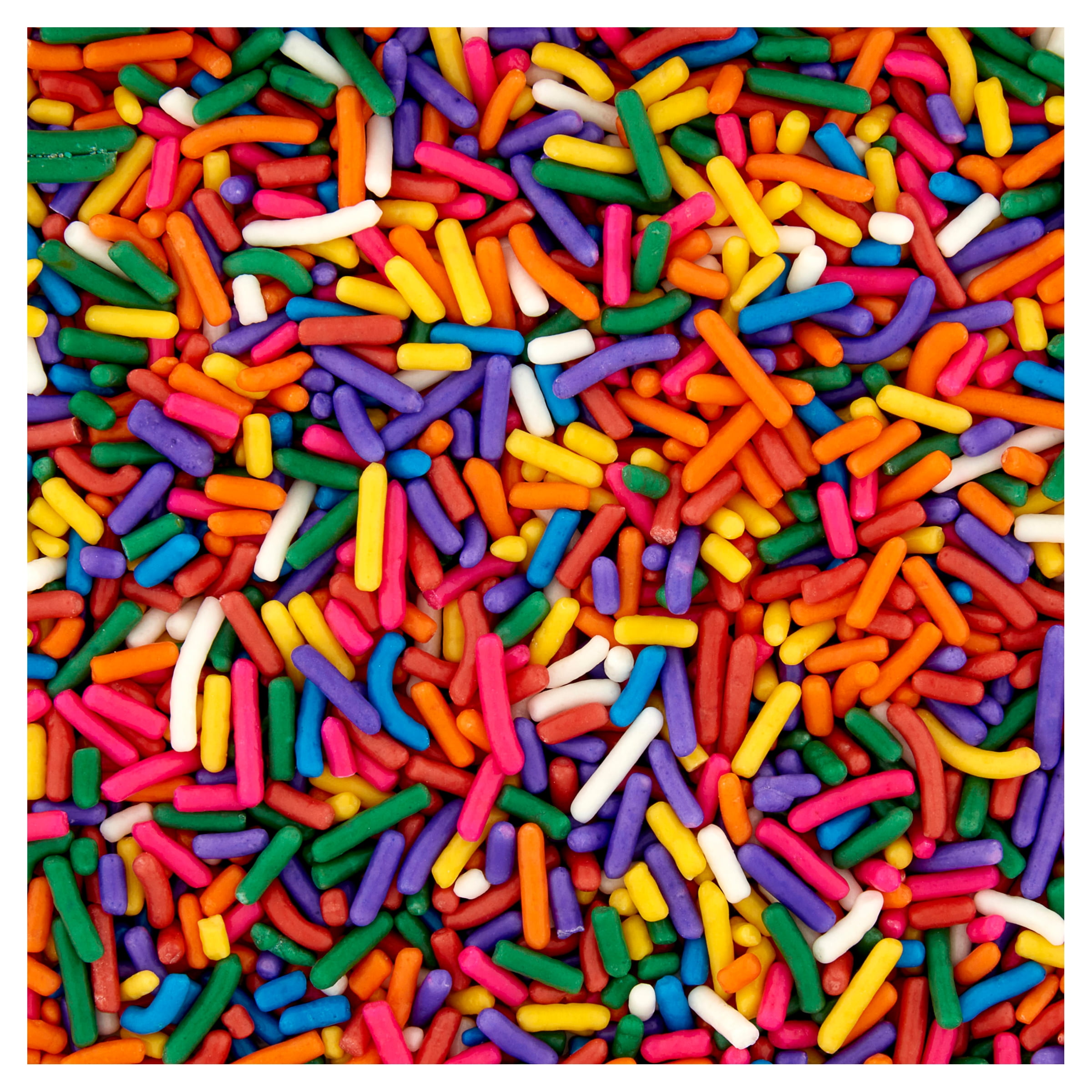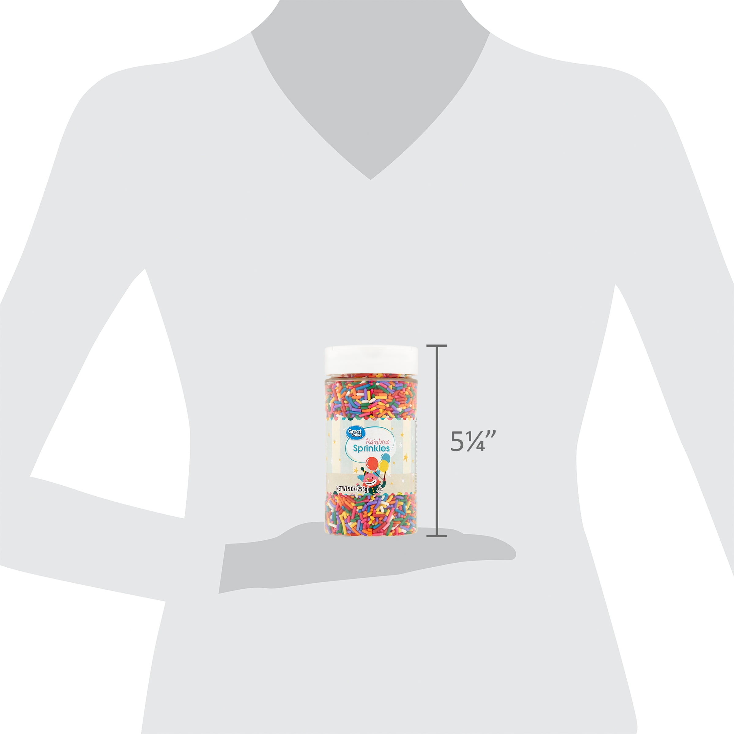 Use Great Value Rainbow Sprinkles to decorate and add fun to your desserts! Sprinkle some of these small, multicolored sprinkles on top of your iced cakes, cupcakes, cookies, ice cream, or other goodies. You can even put them inside your baked treats for an exciting surprise when you cut them open or mix them into the batter for a cute confetti masterpiece! These wonderful sprinkles from Great Value are a must-have in your kitchen, as they will take your desserts to the next level by adding a bit of fun, excitement, and color. They come in a resealable container that helps maintain freshness between uses. Add that special touch to your baked treats with Great Value Rainbow Sprinkles.
