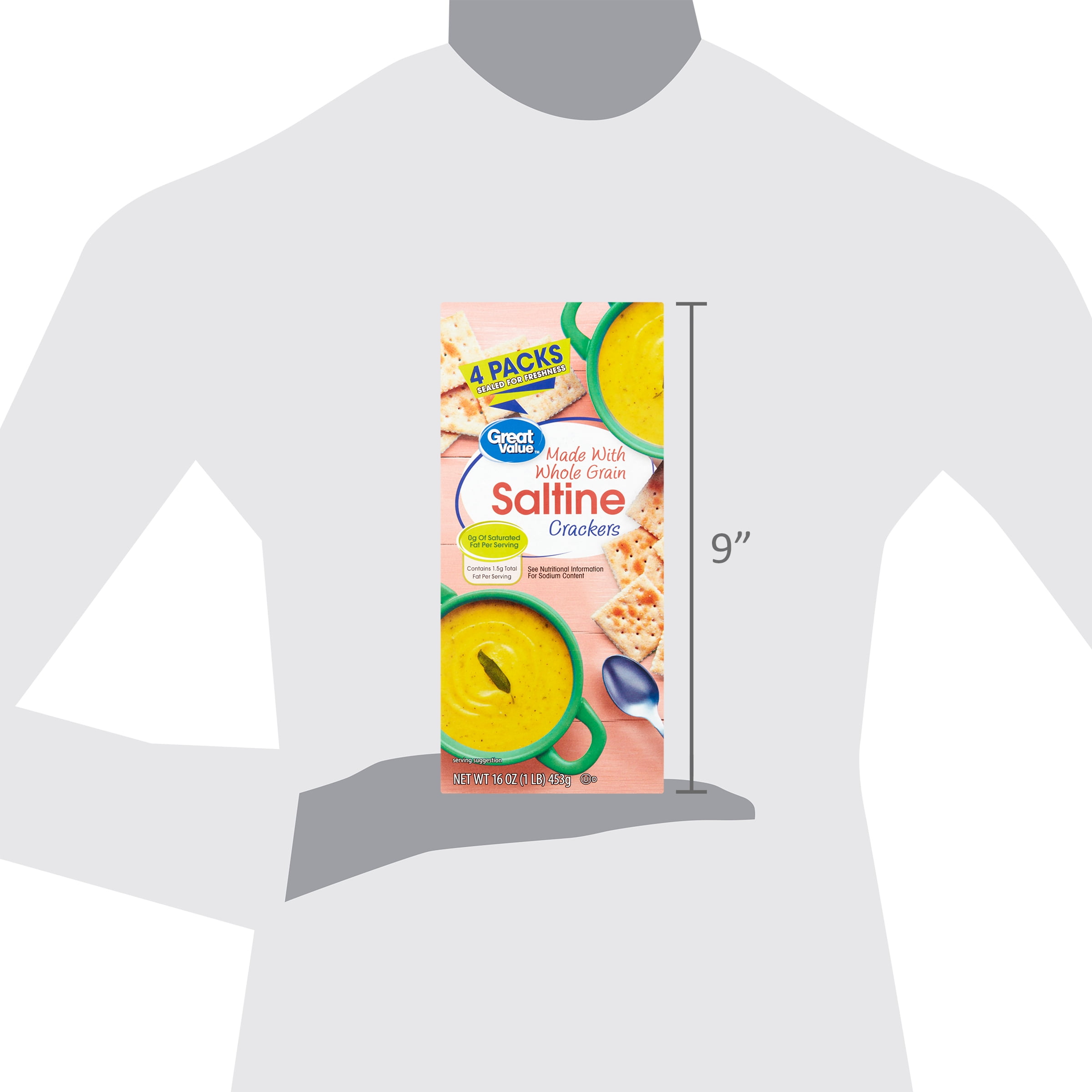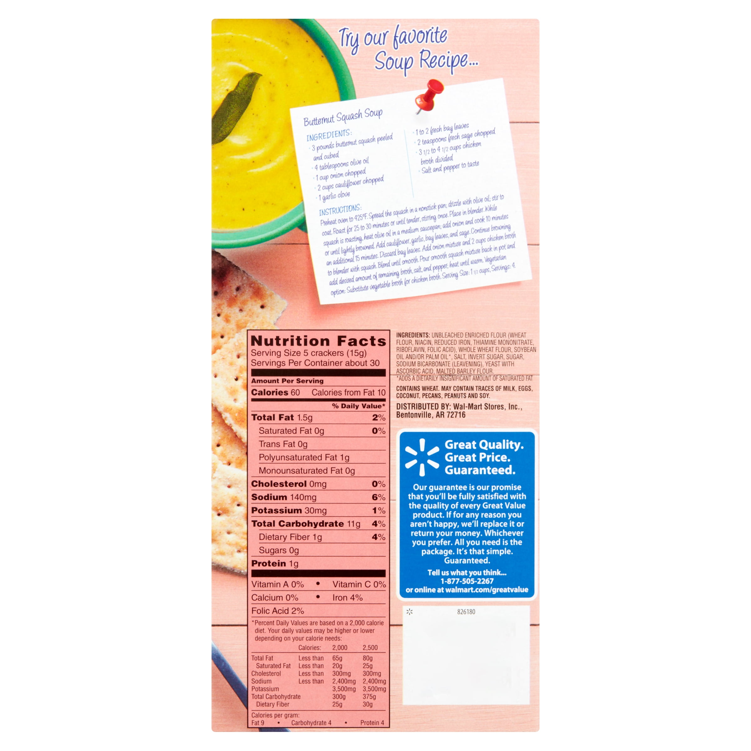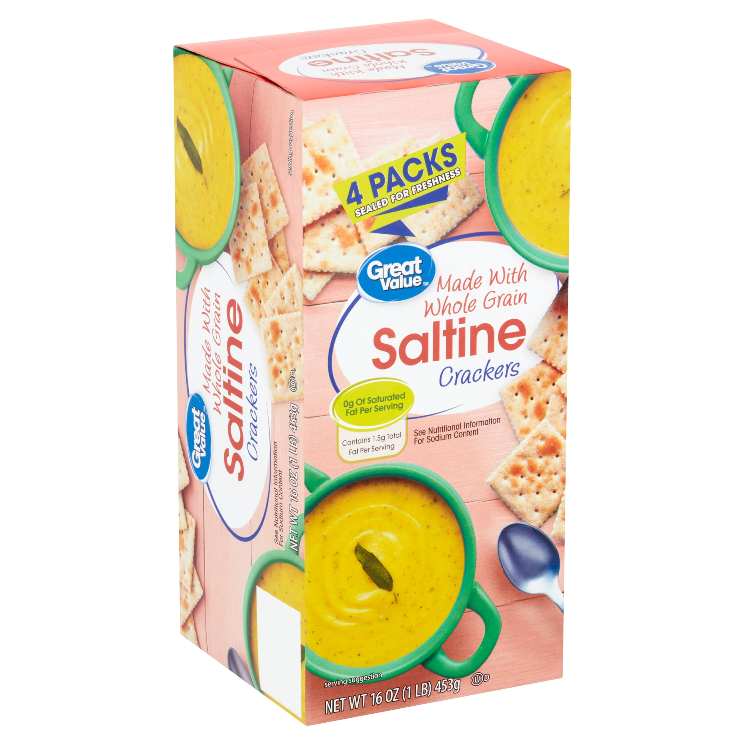 Enjoy the yummy taste and crunchy texture of our Great Value Saltine Crackers. Our saltine crackers are made with whole grain and contain only 60 tiny calories per serving, making them an excellent choice for a healthy lifestyle. Crumble our crackers atop butternut squash soup using the recipe on the back of this package for a warm and creamy lunch you can’t resist. These crackers are also great for snacking, piled high with sliced cheese, pepperoni, cucumbers, and more. Grab a box of Great Value Saltine Crackers today.