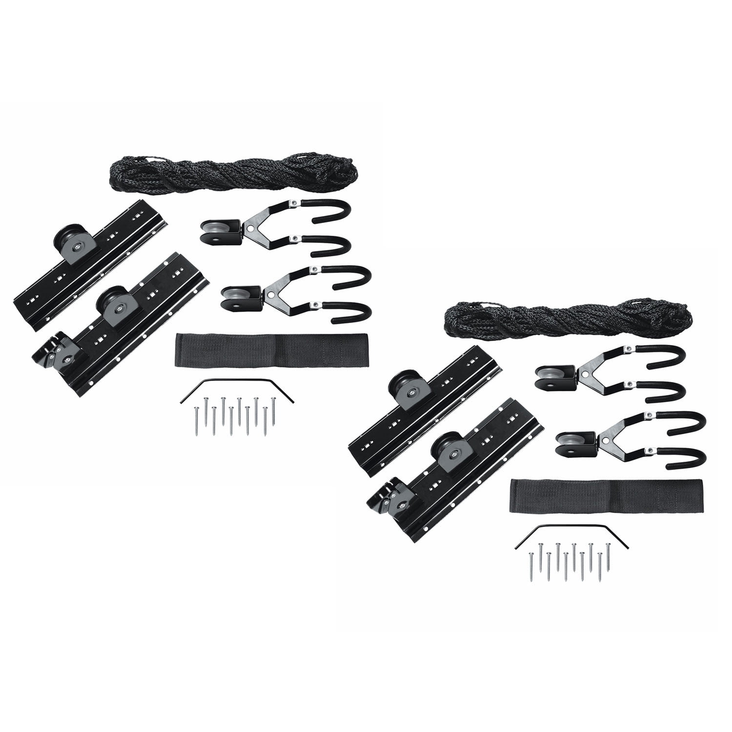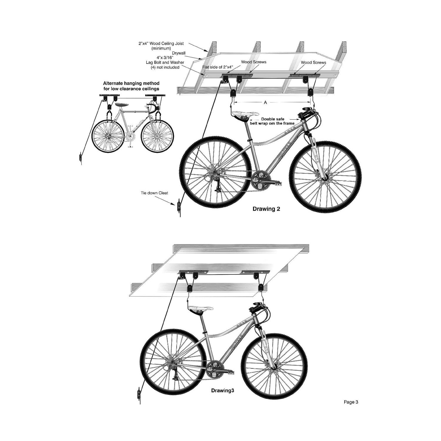 EACH SET HOLDS UP TO 55 LBS -Thicker gauge rope and quality engineered pulleys can easily lift and hold up to 55 lbs, accommodating mountain bikes, cruisers and more. It’s also a great way to store folding and extension ladders! Mount this item as pictured on a 2 X 4 and screw it to the joist, or mount it directly to the joist itself, on ceilings up to 12 ft.