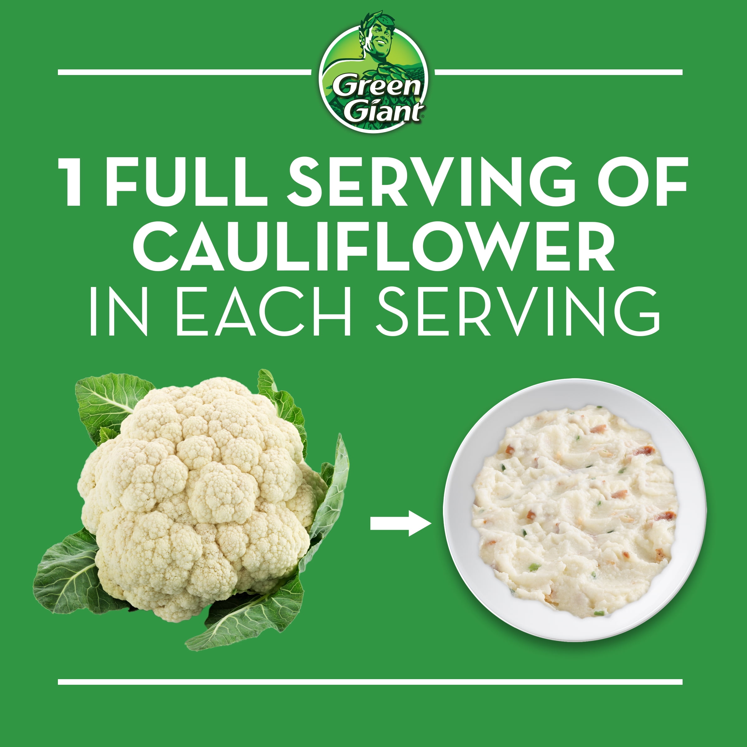 - 40% fewer calories than mashed potatoes†.†40% fewer calories than the leading brand of prepared mashed potatoes.†Green Giant® Mashed Cauliflower Cheddar & Bacon contains 90 calories per 1/2 cup serving. Leading brand of prepared mashed potatoes contains 150 calories per 1/2 cup serving.