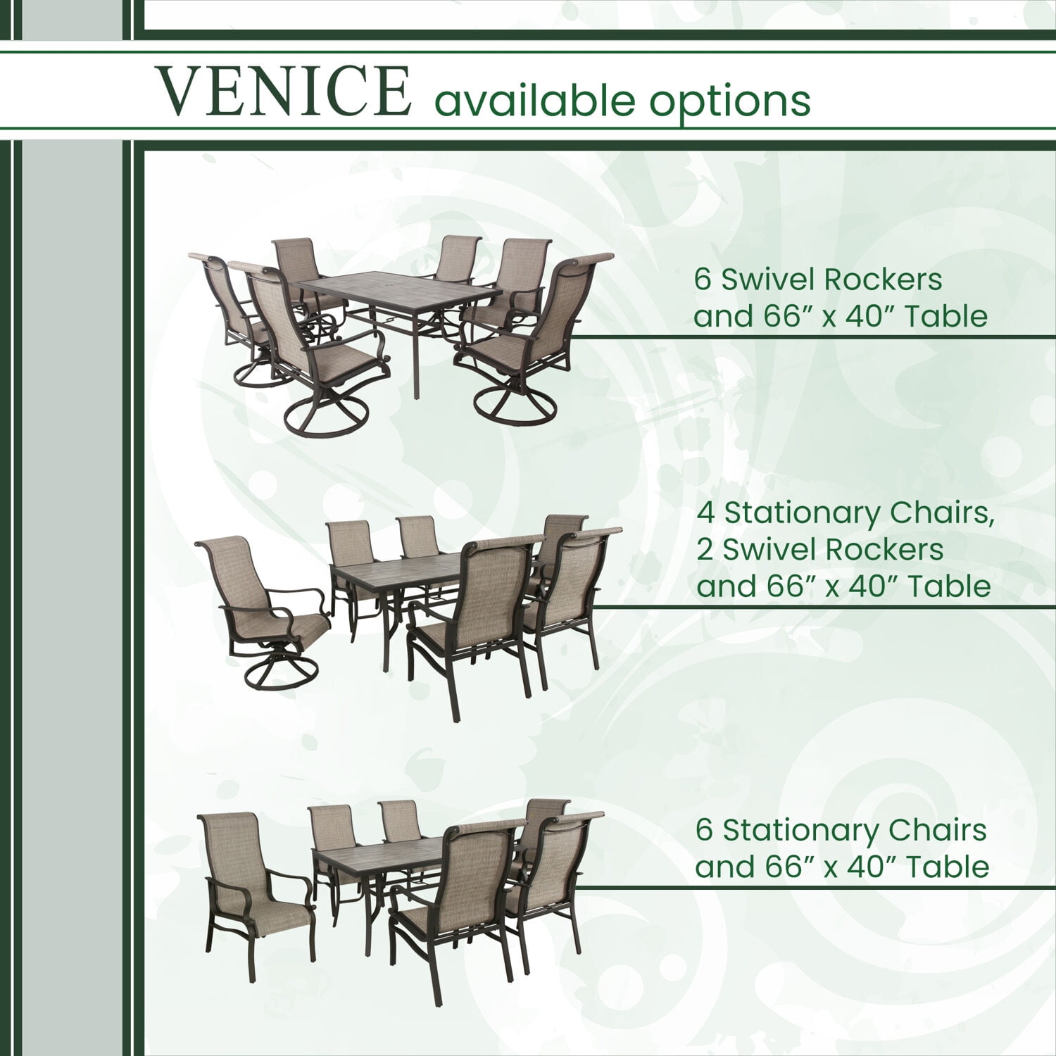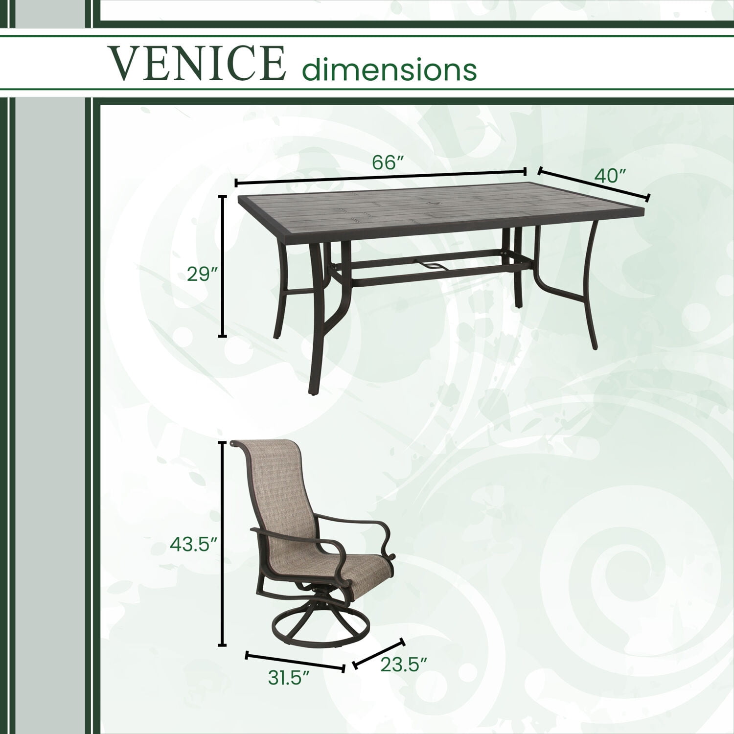 - TIMELESS DESIGN: The Venice Dining Collection by Hanover includes 6 traditional and stylish sling swivel rocker chairs and 66""x40"" rectangle slat top table. The chairs feature tall, sling-back seats that provide upper and lower back support as you dine in comfort. Designed for the ultimate entertainer to accommodate intimate or large gatherings to fit any backyard, patio, deck, or porch.