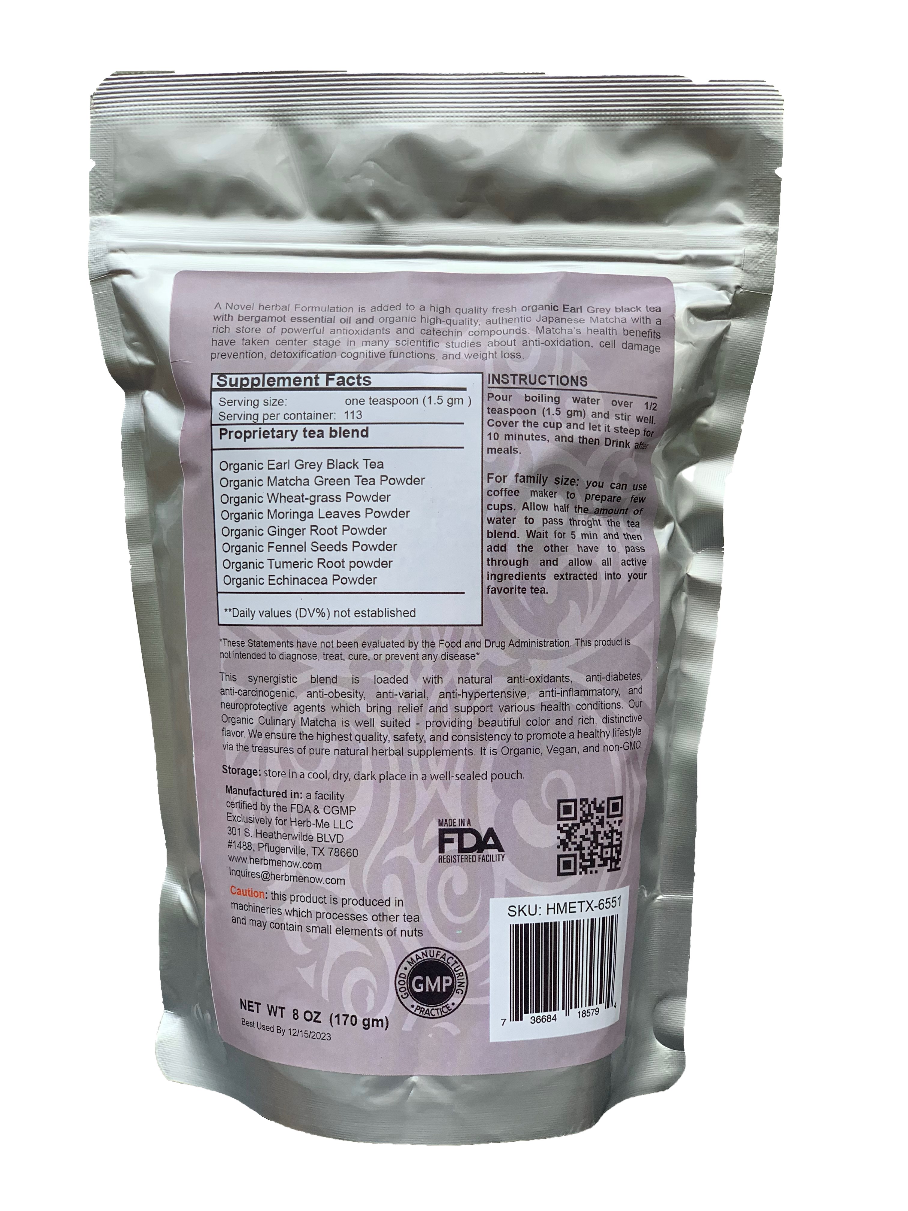 • Novel Herbal Formulation – " Patent Pending" is added to a high-quality Bergamot infused organic black tea leaves, and organic high-quality, authentic Japanese Matcha with a rich store of powerful antioxidants and catechin compounds proven to support healthy blood sugar, reduce obesity, and manage diabetic complications. • Earl Grey Tea “Camellia sinensis” leaves: This is one of the best-known tea blends on the market and becomes a popular drink due to its caffeine kick and renowned Bergamo flavor. Black tea and other Camellia sinensis teas have been shown to lower blood-pressure and reduces the overall risk of cardiovascular disease. Bergamot extract can also lower both LDL cholesterol (the “bad” cholesterol) and total cholesterol • Matcha’s health benefits have taken center stage in many scientific studies about anti-oxidation, cell damage prevention, detoxification cognitive functions, and weight loss • Quality – this is the first organic herbal Earl Grey tea on the market for diabetes support and reduce obesity with its unique caffeine kick and renowned flavor. We ensure the highest quality, safety, and consistency to promote a healthy lifestyle. • To support Diabetes and related complications – This synergistic blend is loaded with natural antioxidants, anti-diabetes, anti-carcinogenic, anti-obesity, anti-viral, anti-hypertensive, anti-inflammatory, and neuroprotective agents which bring relief and support various health conditions. Our Organic Culinary Matcha is well suited – providing beautiful color and rich, distinctive flavor. We ensure the highest quality, safety, and consistency to promote a healthy lifestyle via the treasures of pure natural herbal supplements