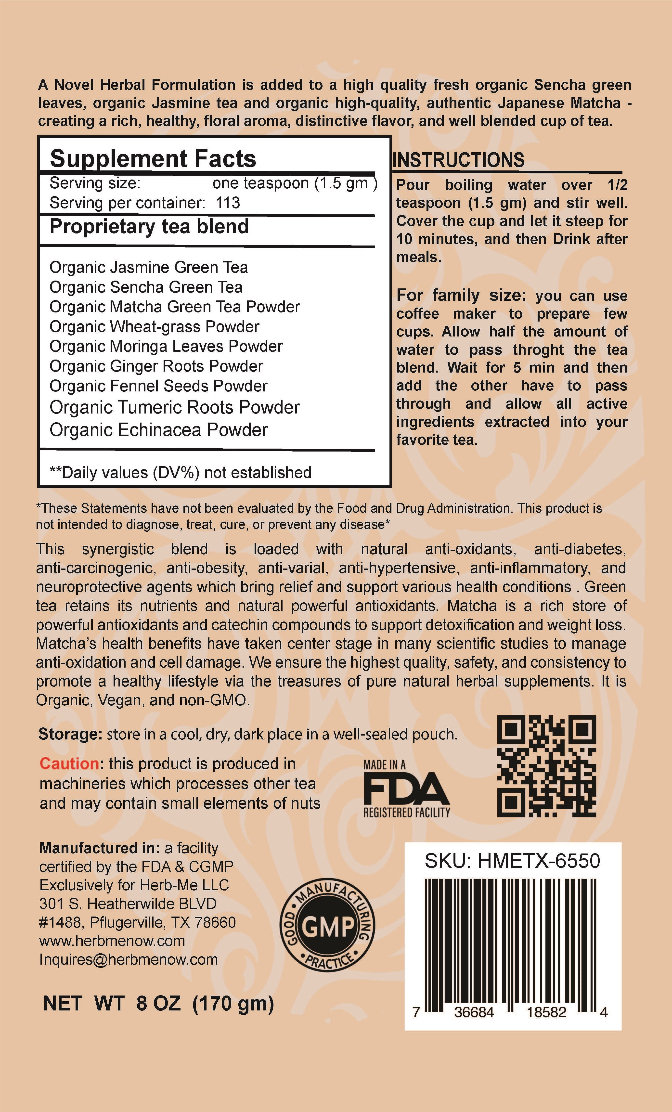 - All Organic Green Tea blend, 113 serving cups, a rich store of bioactive components, including organic Jasmine leaves, organic Sencha green leaves, organic authentic Japanese Matcha powder, organic Wheatgrass powder, organic Moringa leaves powder, organic Cinnamon powder, organic Ginger root powder, organic Turmeric root powder, and organic Echinacea powder.