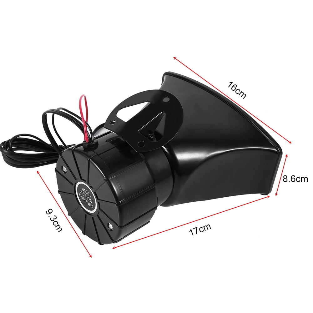 Specifications: Material: ABS Plastic Color: Black Voltage: DC 12V Current: 2.0-2.5A Wattage: 100W Sound Level: 110dB-120dB Horn Diameter: Approx. 9.3cm/3.7" Total Horn Size(L x W x H): Approx. 17 x 16 x 8.6cm/6.7" x 6.3" x 3.4" Package Weight: Approx. 667g Installation: Connect the red wire to the positive pole and the black wire to the negative pole. Fitment: Fit For Most 12V Voltage Cars, Trucks, Boats and Motorcycles Etc.