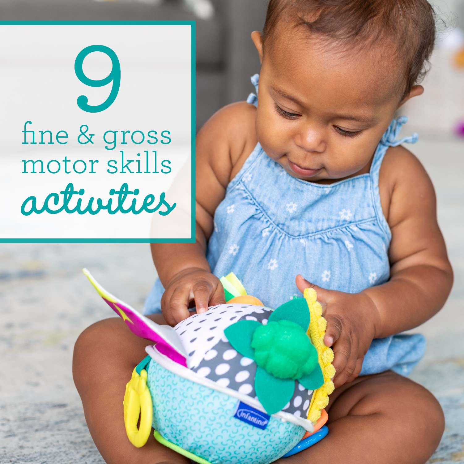 Engaging sensory activities bring 360 degrees of fun to ball time! Little hands will love shaking, grasping and tossing this easy to hold ball. Busy little hands and curious minds can engage in skill-led activities, like peeling back fruit, clacking rings, and making rattle sounds that encourage fine and gross motor skills. Perfect for sit & play, tummy time and on the go adventures!