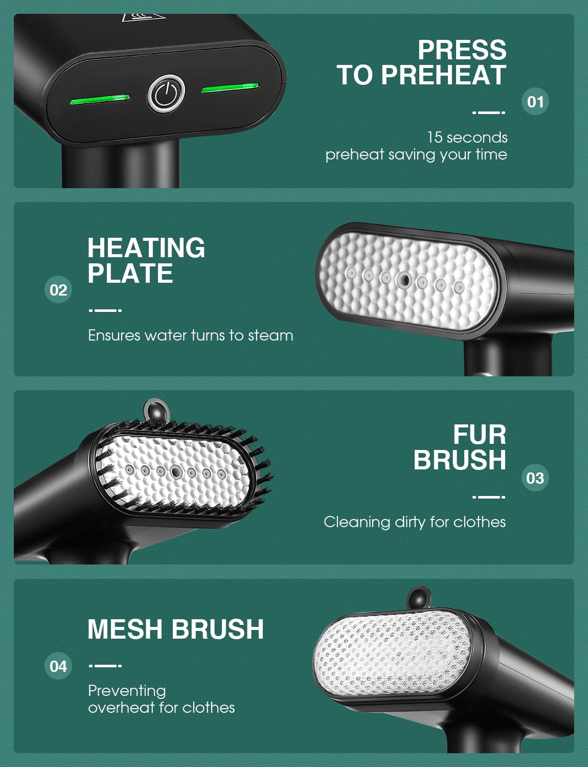 - POWERFUL & 15S PREHEAT– It is portable, powerful, and compact. This steamer iron combines impressive 1200-watt power and 15s preheat, maximum efficiency to quickly remove all wrinkles almost instantly.The water tank holds up to 5oz/ 140ml of tap water, and our embedded water tank design prevents the steamer from tipping or spilling hot water. With this travel steamer iron, steaming will be enjoyable for everyone.