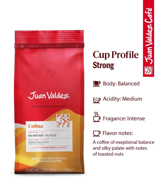 A coffee of exceptional balance and silky palate with notes of toasted nuts. Each Colombian Coffee harvest produces among its fruits a small percentage of "Caracolito" beans. From this exotic bean, Juan Valdez® has developed "Colina," a balanced coffee with smooth texture, silky broaden body and notes of toasted nuts. Each Juan Valdez® Coffee is the result of the work and commitment of more than 500,000 coffee growers and their families. With your purchase, you are directly contributing to the improvement of their living conditions; a percentage of the sales from the Juan Valdez® brand is reinvested in the wellbeing of the growers.100% premium, hand-picked Colombian coffee, Impressive character with a note of toasted nuts, Acidity: Medium, Fragrance: Intense, Body: Balanced