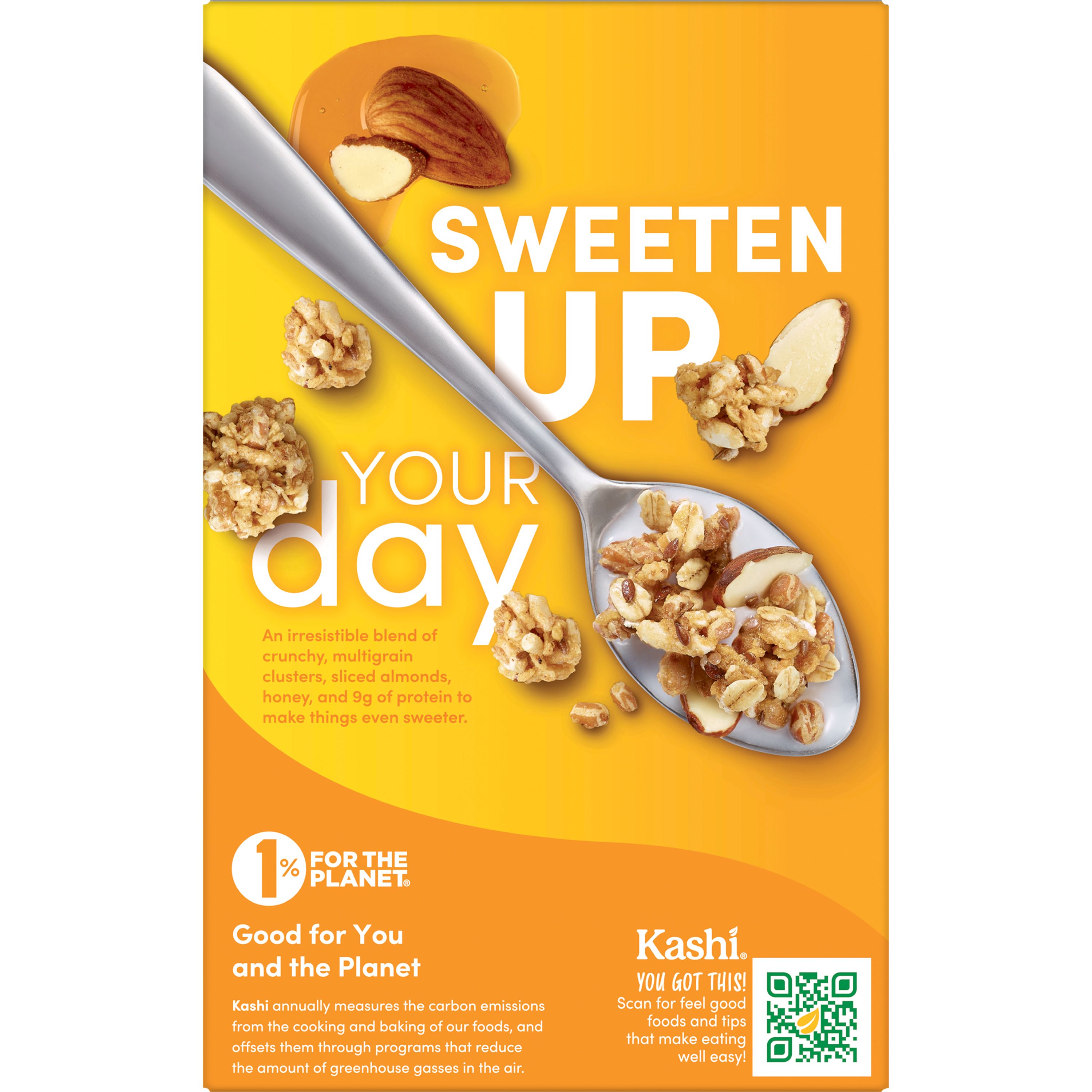 Treat yourself to the delicious taste of crunchy multigrain clusters with sliced almonds, whole flax seeds, oats, and a touch of sweet honey in every bite of Kashi GO Honey Almond Flax Crunch cereal. Includes 1, 14-ounce box of breakfast cereal. Whether it’s starting the morning with a bowlful or enjoying a midday snack, Kashi GO breakfast cereal delivers a sweet, satisfying crunch that’s sure to please. Non-GMO Project Verified, each wholesome serving provides 9g of protein and 8g of fiber; Kashi GO Honey Almond Flax Crunch breakfast cereal is the perfect way to power your day. Enjoy with your favorite milk or pair with fruit or yogurt for a delicious breakfast. For a portable snack, pack reusable baggies into your purse, lunch box or gym bag. Kashi GO Honey Almond Flax Crunch cereal also makes a great after dinner treat by the handful or as a topping on your favorite ice cream. Anytime is the right time for Kashi GO Honey Almond Flax Crunch cereal. Anytime is the right time for Kashi GO Peanut Butter Crunch cereal. Kashi is making planet-positive choices to lower our company’s impact on climate change. We measure the amount of emissions from the manufacturing plants that create our foods and invest in renewable energy projects and programs in the US that remove the same amount of emissions from the air.