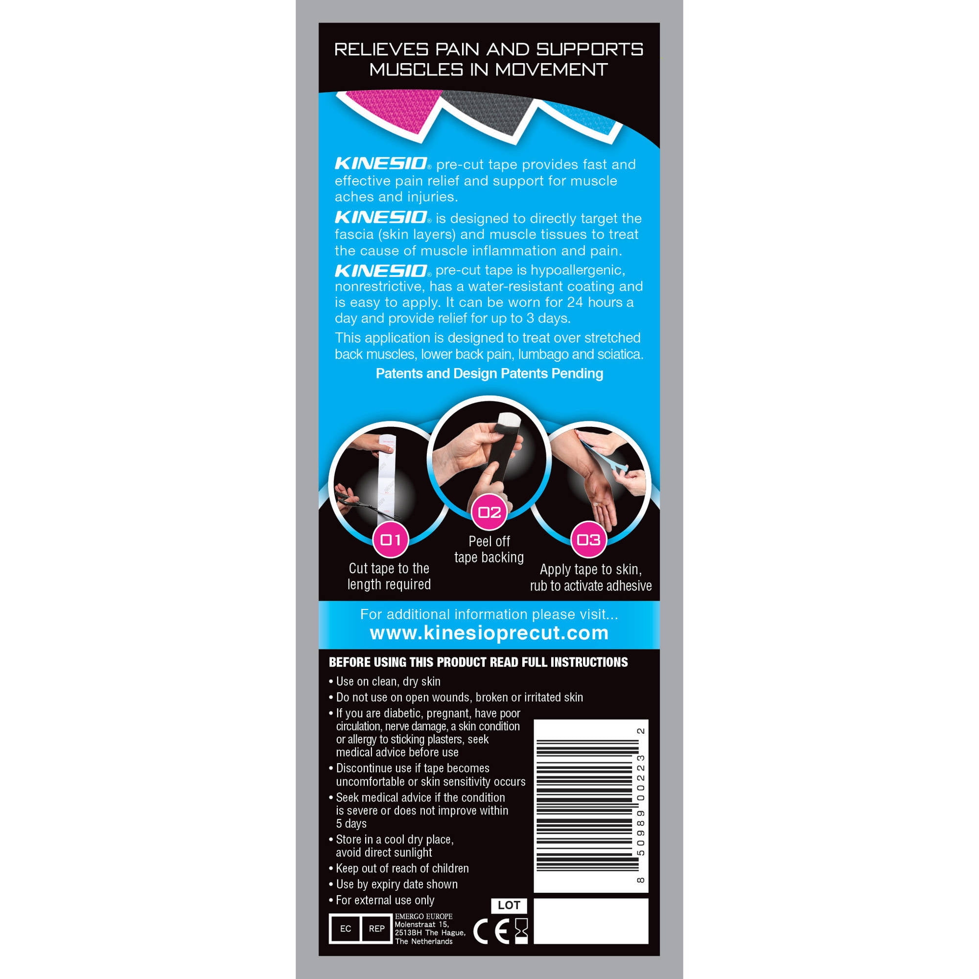 Kinesio Pre-Cut Back Support is designed to support overstretched back muscles, relieve lower back pain, and to address lumbago and sciatic conditions. Each packet contains a single-use, customizable set of tape strips and instructions. Each Back Support application comes with one pink and two black I-strips cut from genuine Kinesio Tex Tape Gold. pre-cuts, low back, eachKinesio Tape pre-cuts, low back, each