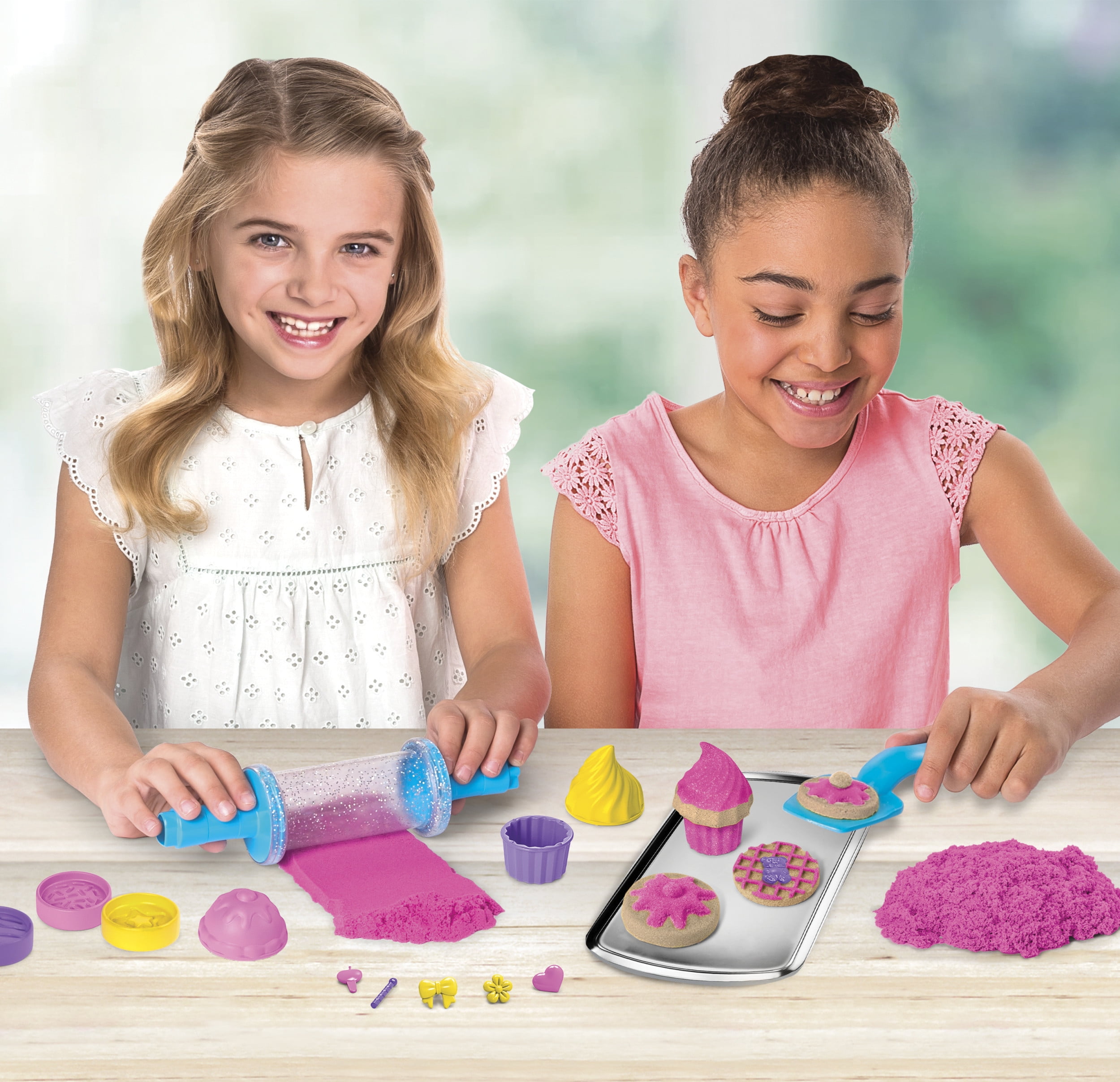 - 16 TOOLS AND MOLDS: Roll Kinetic Sand with the sparkly rolling pin and stamp a cookie! Create cupcakes with the molds, add decorative toppings and slide sweets onto the serving tray with the spatula!