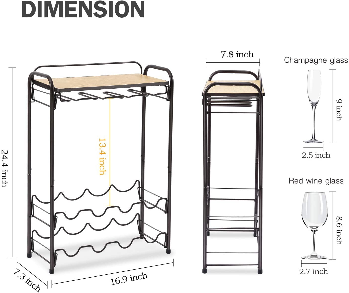 - This wine diplay shelf is a perfect combination of wine holder, table top and wine glass holder. It can hold up to more than 8 wine bottles and 8 glasses. And also can put your food, drinks, plant, photograph on the top table.