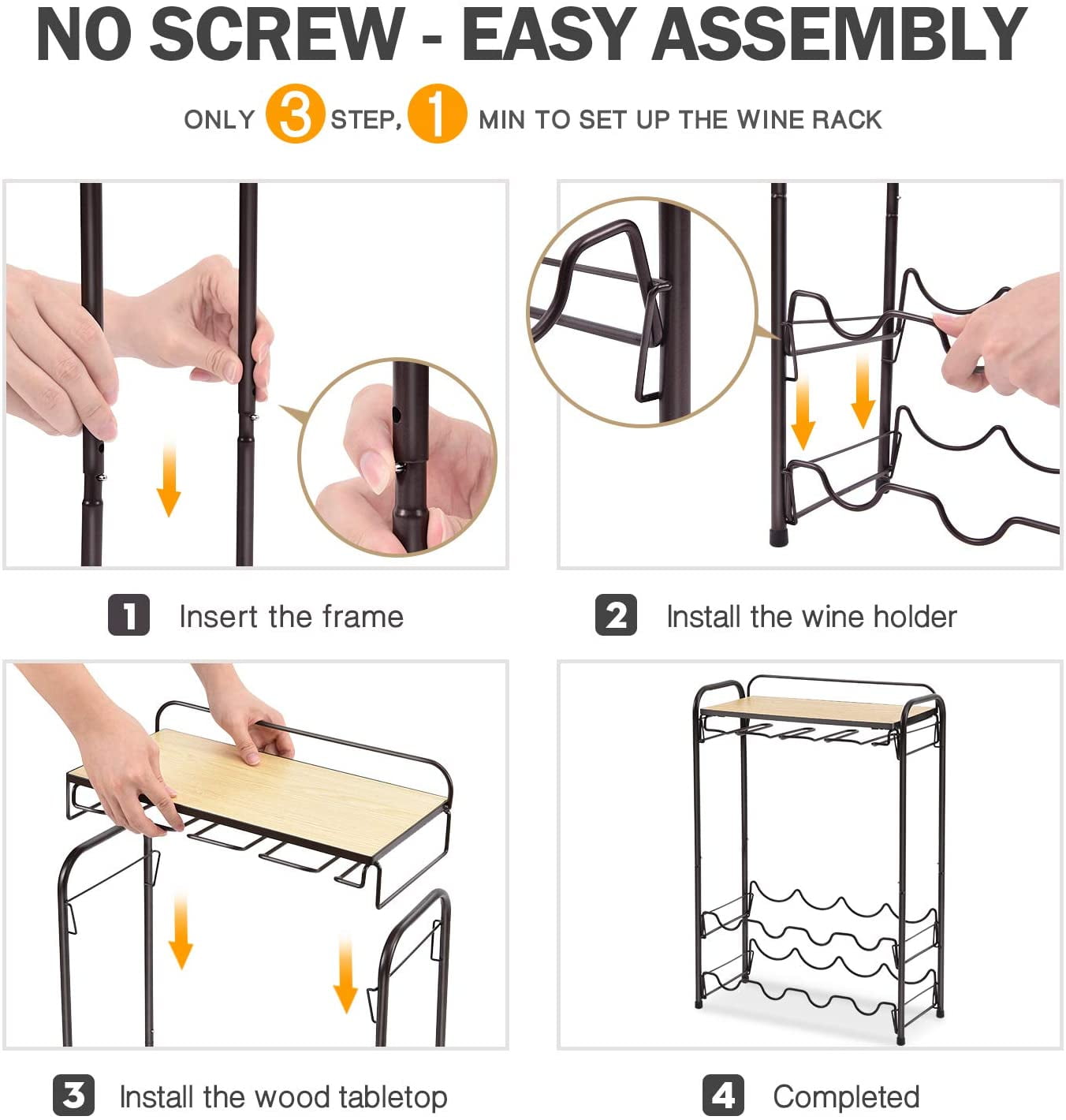 Free Standing Wine Rack. NO SCREWS,NO TOOLS,ASSEMBLY. This wine rack is made of elegant powder coating steel and attractive wooden board, which is suitable for any space such as kitchen, living room, study, wine cellar and bar. The innovative snap-on design ensure it can easy to install without any tools. If you don’t want to waste too much time in installation, this wine rack will be a great choice. Unique 3 in 1 design, combine with wine rack, wine glass holder and tabletop. It could hold up to 8 standard wine bottles and 4 wine glasses.