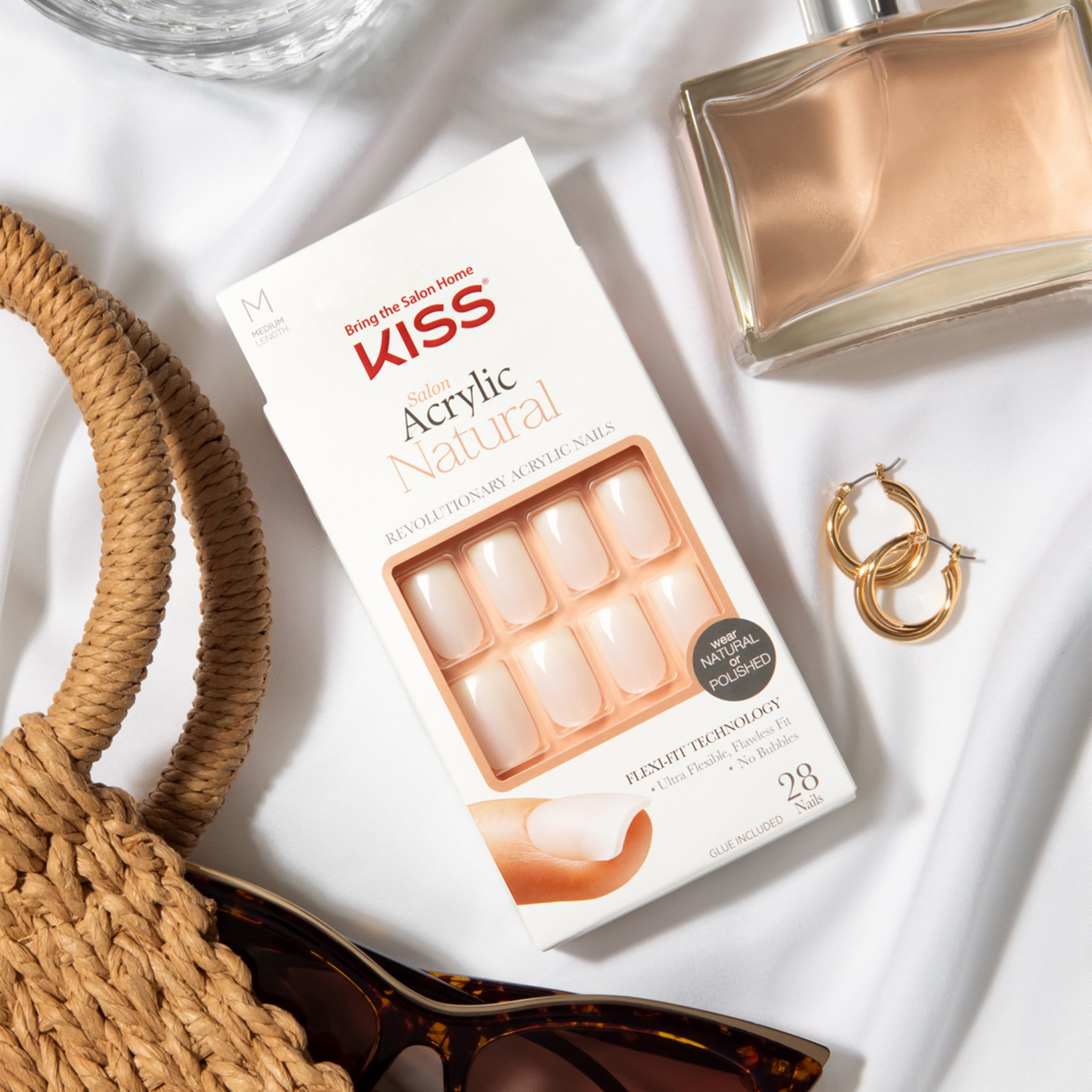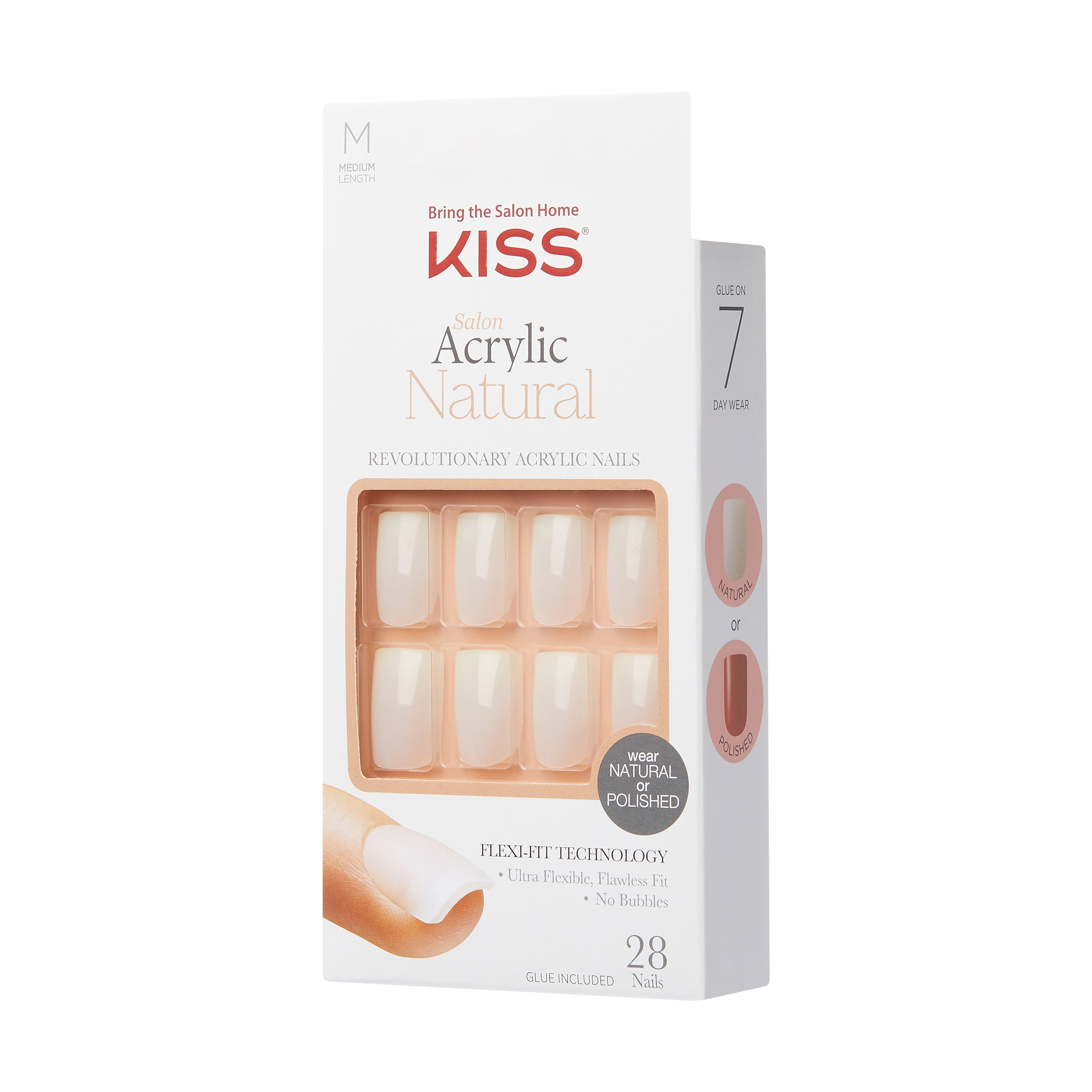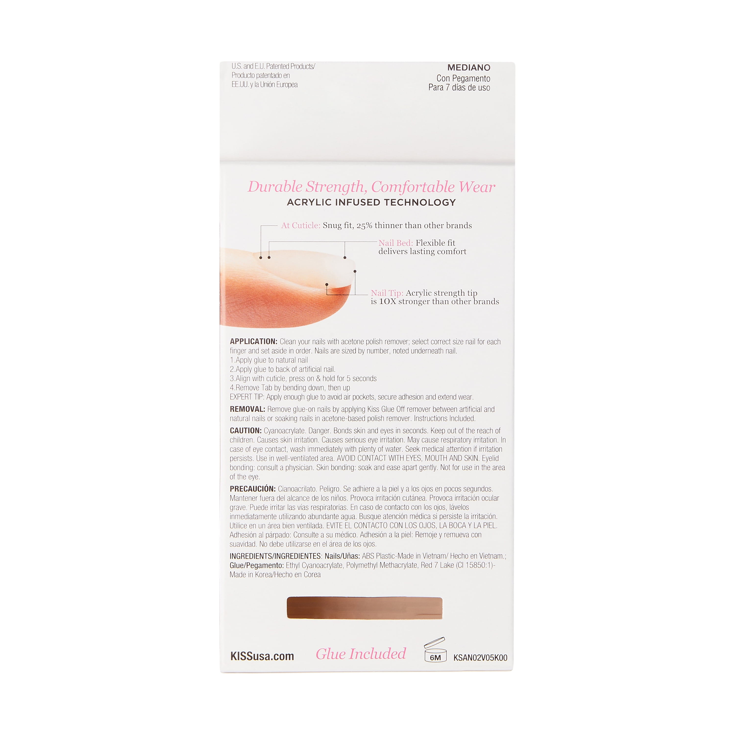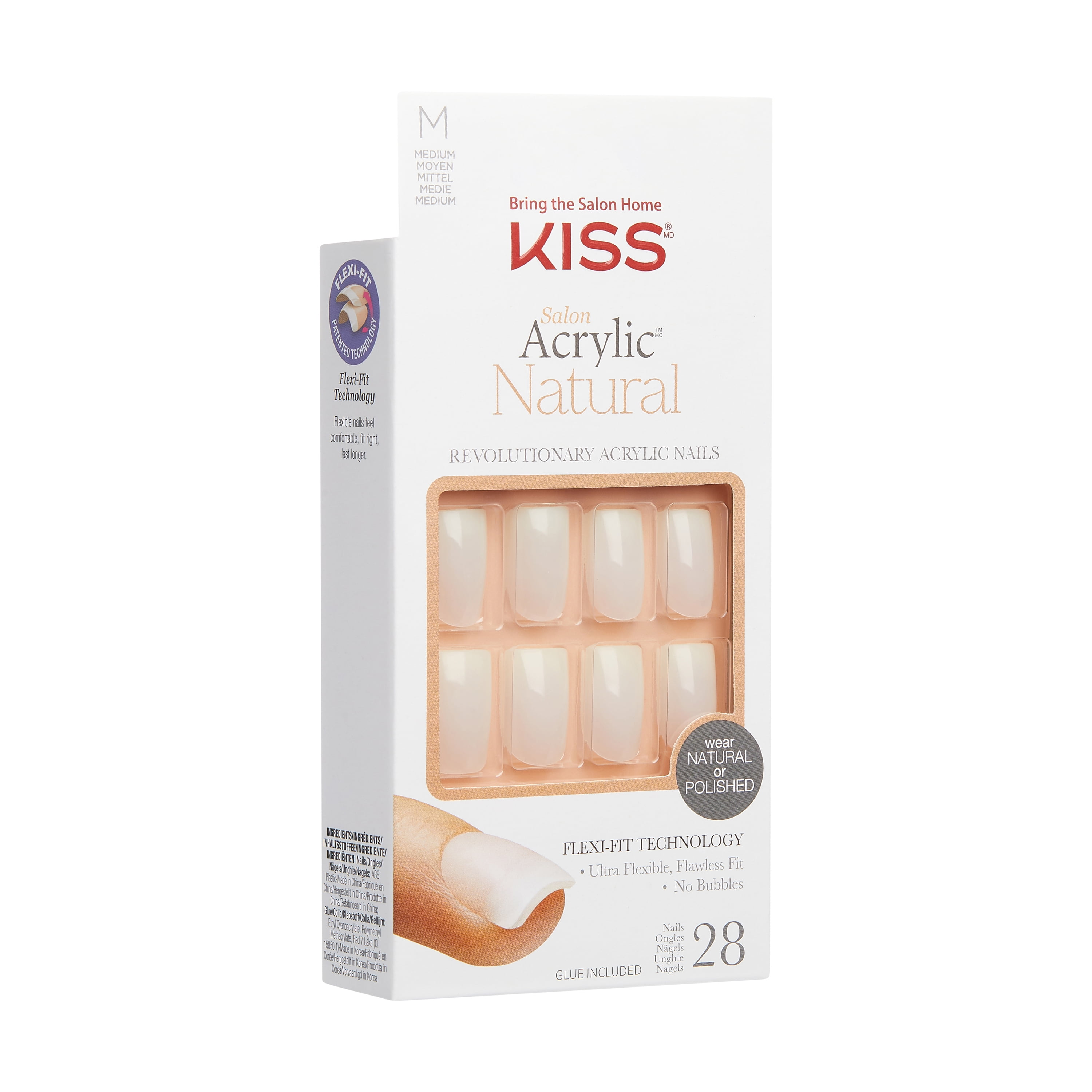 Acrylic Nails, Natural, Medium, Box 28 CT New. Revolutionary acrylic nails. Bring the salon home. Better than salon acrylic. Flexible, flawless fit. Never chips. 10X stronger. Wear natural or polished. Quality products that deliver salon results. Durable strength, comfortable wear. Acrylic infused technology. At Cuticle: Snug fit, 25% thinner than other brands. Nail Bed: Flexible fit delivers lasting comfort. Nail Tip: Acrylic strength tip is 10X stronger than other brands. Kissusa.com. Glue included. Ideal for polish & art. Flexi-Fit patented technology. Flexi-Fit Technology: Flexible nails feel comfortable, fit right, last longer. Glue on: 7 day wear. Natural or polished. Kit Contains: 28 nails, pink gel glue 0.07 oz (2 g), 1 manicure stick, 1 mini file. Nails: Made in China. Assembled in China. Application: Clean your nails with acetone polish remover; select correct size nail for each finger and set aside in order. Nails are sized by number, noted underneath nail. 1. Apply glue to natural nail. 2. Apply glue to back of artificial nail. 3. Align with cuticle, press on & hold for 5 seconds. Expert Tip: Apply enough glue to avoid air pockets, secure adhesion and extend wear. Removal: Do not force or pull nail off. Trim & file surface to disrupt protective top coat. Soak nail in Kiss All or One Artificial Nail remover or acetone polish remover until soft. Wipe off softened nail & glue. Good for 6 months once opened. Cyanoacrylate. Danger. Bonds skin and eyes in seconds. Keep out of the reach of children. Causes skin irritation. Causes eye irritation. May cause respiratory irritation. If in Eyes: Rinse cautiously with water for several minutes. Remove contact lenses if present and easy to do so. If on Skin: Wash with plenty of soap and water then gently peel apart. Seek medical attention. Avoid breathing vapors. Use only as directed. Use only in well-ventilated area. Do not use if nail or surrounding skin is damaged or inflamed. 28 nails Port Washington, NY 11050 2017 Kiss Products, Inc.Kiss Salon Acrylic Natural Euphoria