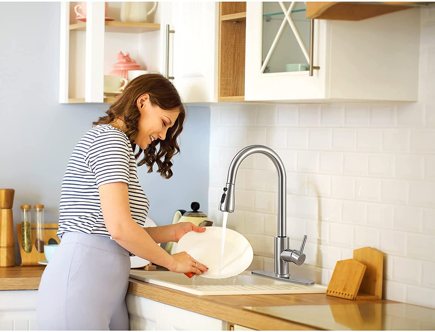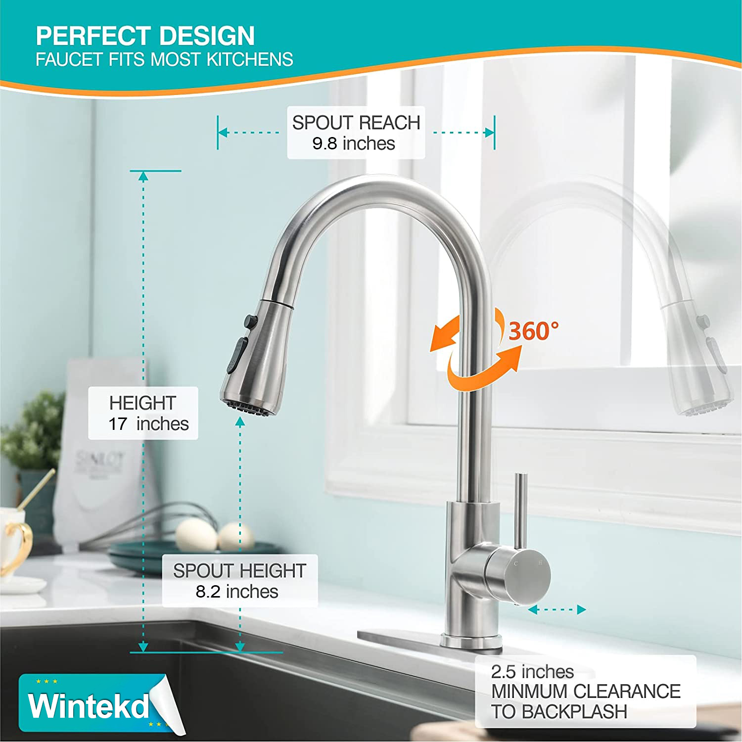 With pull down sprayer, Wintekd kitchen faucet can easily reach all areas of sinks and complete chores with maximum efficiency. Relying on special coating craft, the surface of brushed nickel kitchen faucets finish resists corrosion, fingerprints and water spots, Lifelong leak-free performance. The kitchen sink faucet with multitask modes (spray/stream/ pause) sprayer renders aerated stream for filling water, powerful spray for rinsing, pause for avoiding splashing facilitates various kitchen tasks and gets rid of messy kitchen troubles.