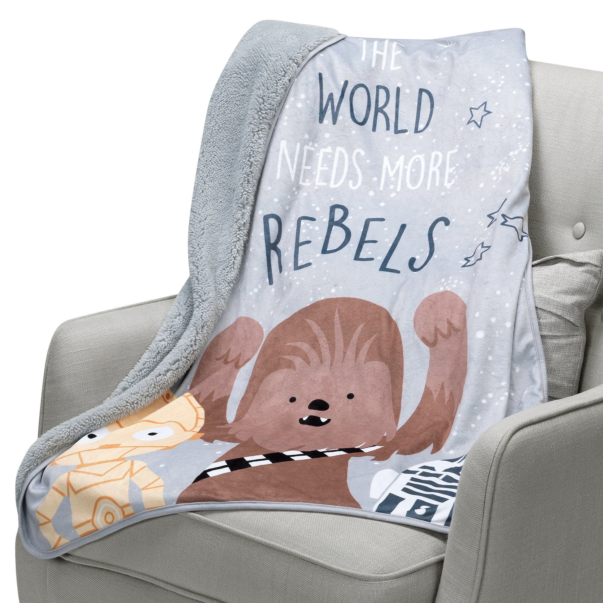 The World Needs More Rebels is printed at the top of this Star Wars baby blanket in dark gray and white. Made in a luxurious minky fabric with a gray Sherpa back for comfort and warmth. Chewbacca is printed on the front center and is 18” tall. He stands in between our favorite droids, R2-D2 and C-3PO. Sized at 30” X 40”, this officially licensed Star Wars blanket is the perfect size for a stroller blanket, using over a car seat or just to keep your little one warm and cozy. A top baby registry pick and makes a perfect baby shower or welcome home baby gift.