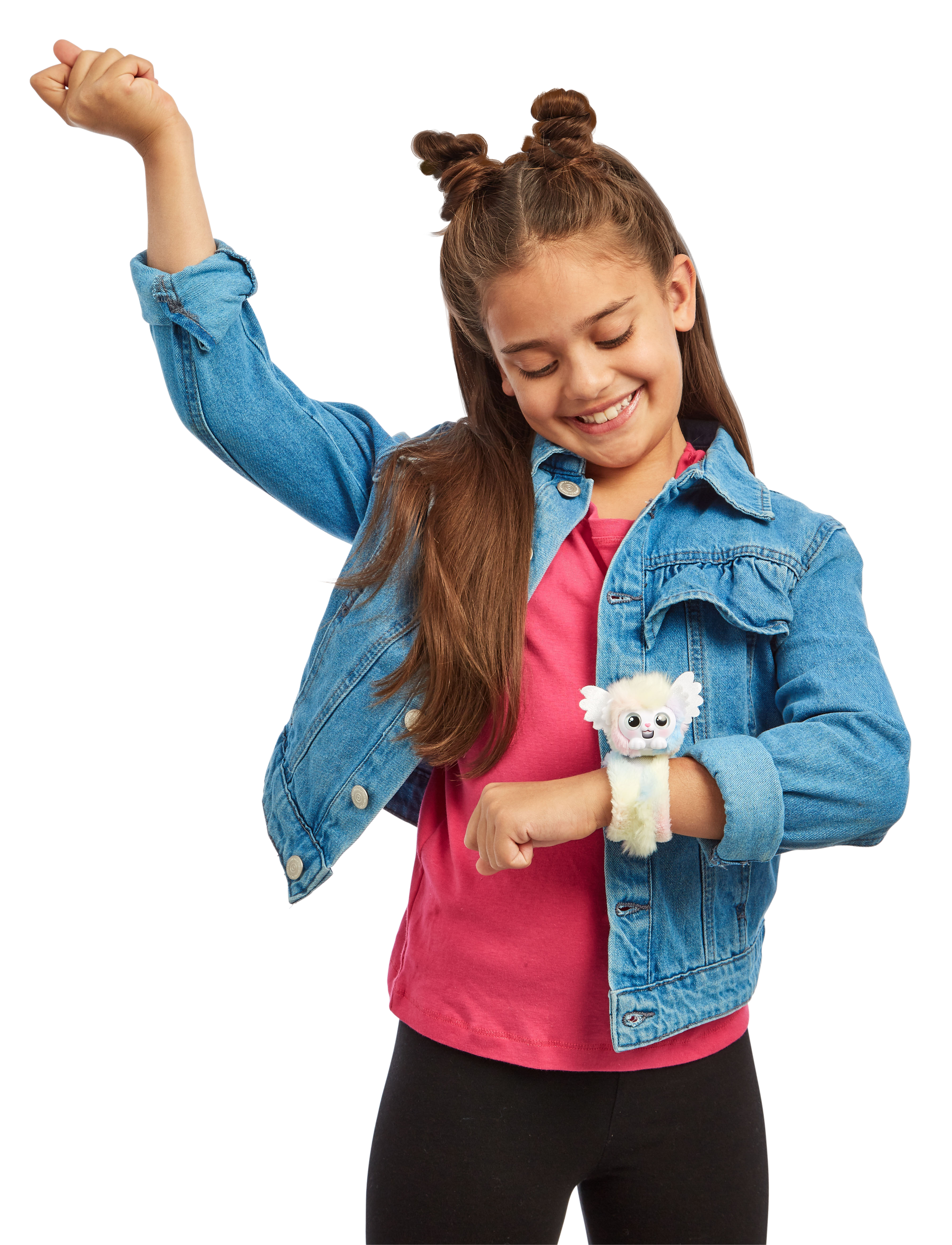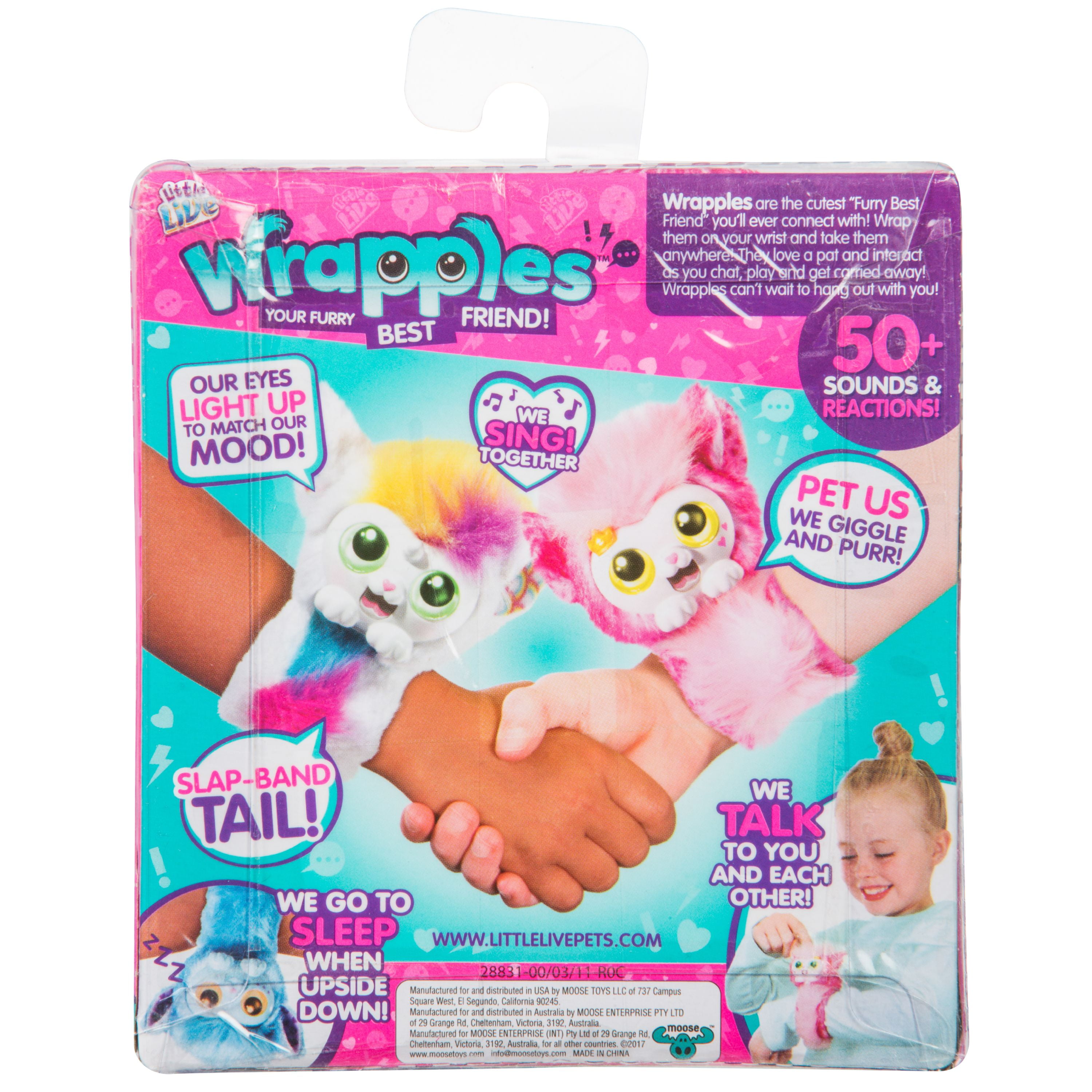 Wrapples are the cutest "Furry Best Friend" you’ll ever connect with! Wrap them on your wrist and take them anywhere. They love a pat and interact as you chat, play and get carried away! Slap their "Slap-band" tail on your wrist and take them with you! These adorable little friends have over 50 sounds and reactions! Watch as they come to life on your arms. Their big eyes light up to match their mood. Wrapples love to talk to you and to each other! They love to be pet and tickled. Hear them giggle and purr! Bring them close to each other and they will sing together! Hang them upside-down and they will go to sleep! Wrapples can’t wait to hang out with you!