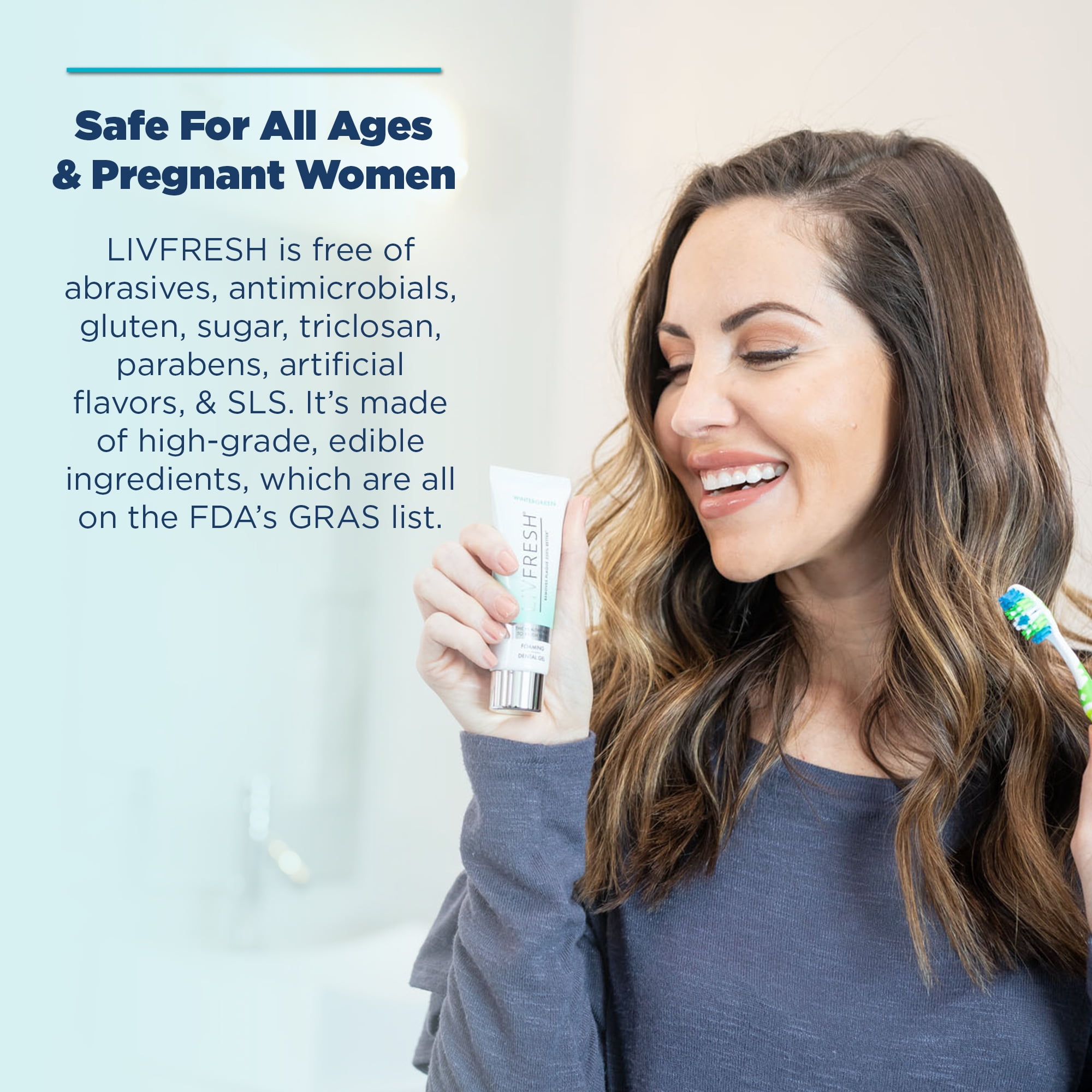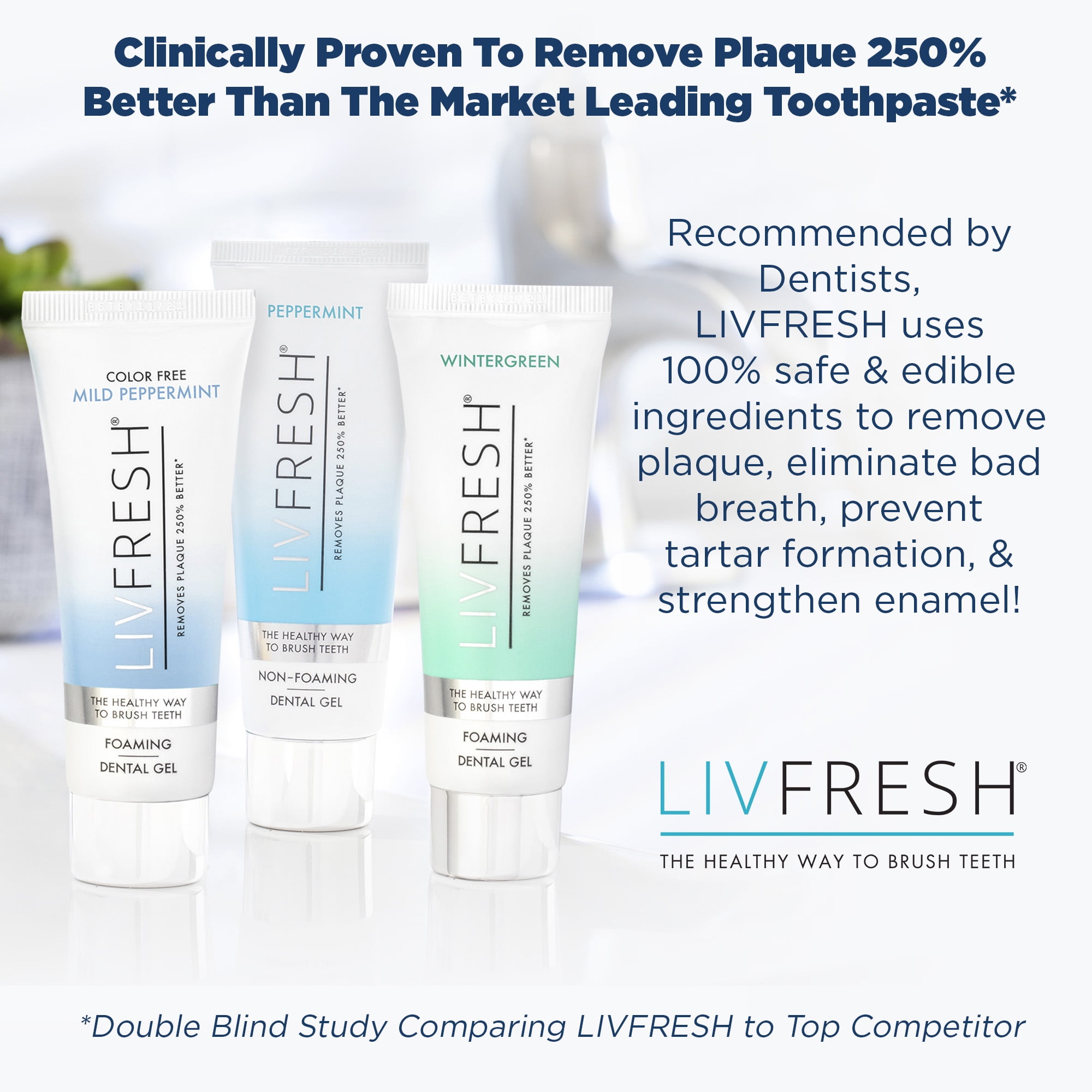 Recommended by Dentists, including the former President of the ADA, LIVFRESH is clinically proven to remove plaque 250% better at than toothpaste! Using 100% edible ingredients, LIVFRESH removes plaque, eliminates bad breath, and prevents tartar formation. LIVFRESH is safe for all ages and pregnant women. Our dental gel contains ZERO harmful ingredients, including gluten, sugar, sodium lauryl sulfate (sls), triclosan, sulfates, phthalates, parabens, & abrasives! LIVFRESH contains a burst of mild peppermint flavor, a unique non-foaming action, and a color-free (dye-free) gel. Featured by multiple major news outlets!