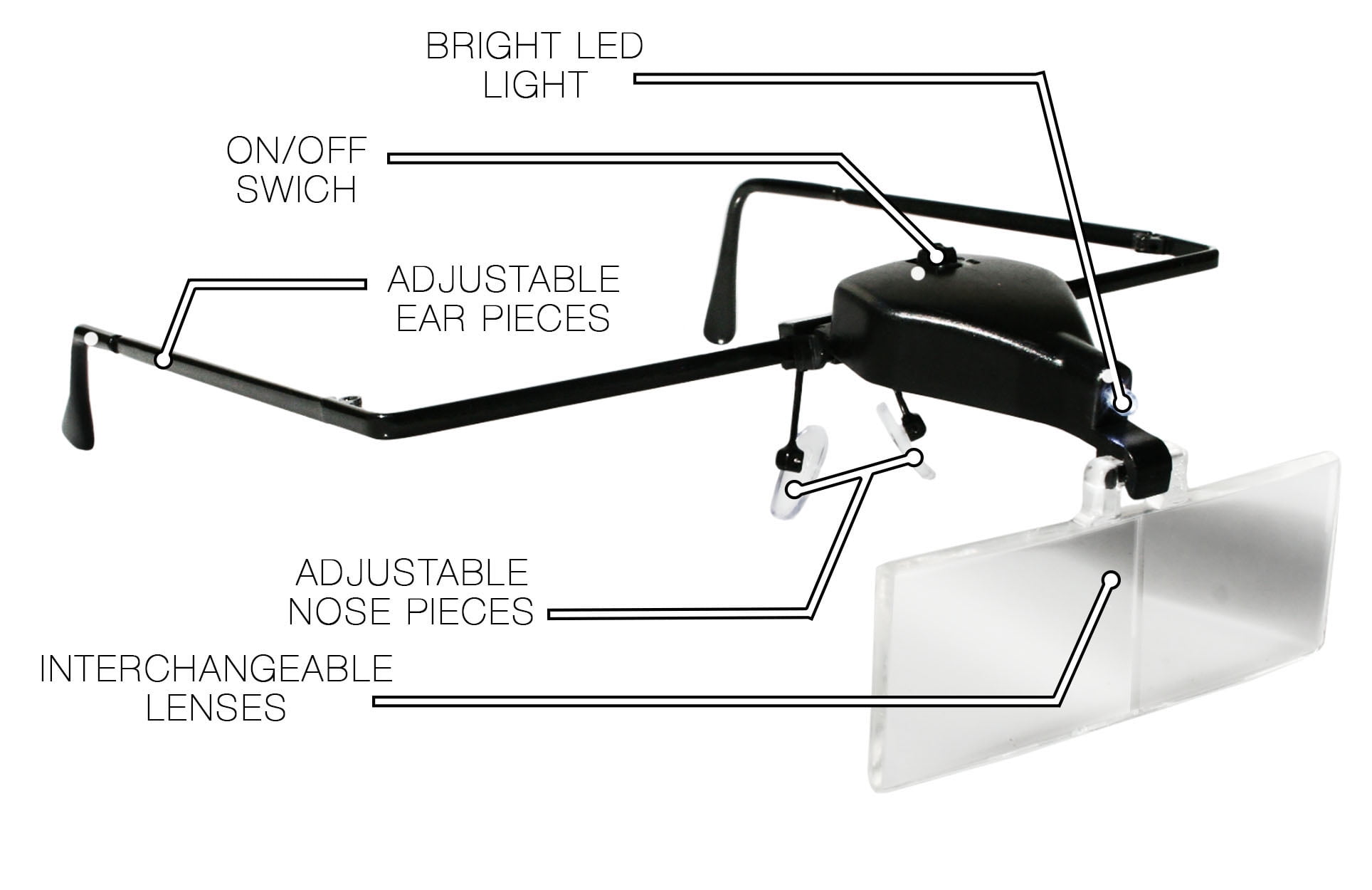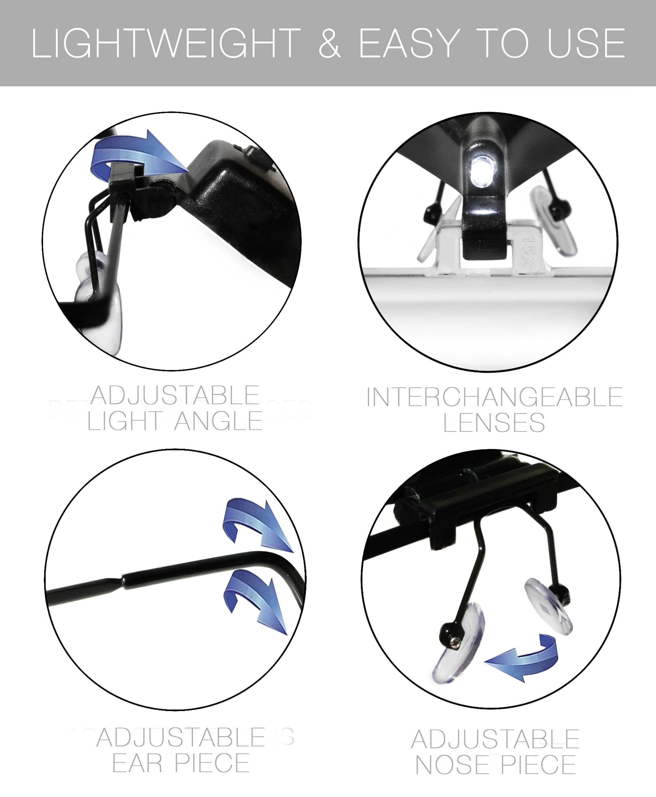 Magnifying Glasses That Are So Light Weight You Forget You Have Them On. See Detail Hands Free. The LED Light Makes It Very Easy To See. This Magnifier Is A Top Choice Among Professionals And Designed For Esthetician, Hobbyists, Jewlers, Seniors, Watch Circuit, And Professionals. Llightweight And Adjustable Nose And Ear Pieces To Fit Any Face. The Versatile Set For Your Home, Office Or Workshop. The Durable Construction Of Our Lenses And Sturdy Frame Are Portable And Tough Enough To Take With You Wherever You Go or Travel. Illuminate While You Magnify. Equipped With One Bright Energy-efficient LED Light Built Into The Glasses’ Frame. The Light Provides An Evenly Lit Viewing Area. The Perfect Lens For Any Task.