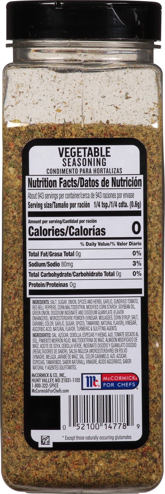 McCormick vegetable seasoning is a specialty blend of vegetables, herbs and spices, including chives, leeks, sun-dried tomatoes, red bell peppers, garlic, tomatoes and onions. McCormick Grill Mates Vegetable Seasoning naturally elevates the flavor profile of vegetables and vegetable dishes. Use this product this summer for pasta salad, roasted summer vegetables, veggie dip and more.Dry spices offer short preparation times, long shelf lives and endless versatility. This pre-mixed veggie seasoning delivers great-tasting, consistent results regardless of your cooking method. It will also help you cut down on preparation and take the guesswork out of adding delicious flavor. Your staff can bypass the individual measuring process and save time with access to a ready-to-use vegetable seasoning blend.This product comes in a practical bottle with an easy-to-use, hinged lid. The 20-ounce container ensures you have an ample supply for all your cooking needs. What’s more, the product’s large size means you run out less often and save money compared to purchasing smaller containers individually.While this vegetable seasoning blend is excellent for dressing up classic vegetable dishes, you can also use it on exciting new recipes. Inspire creativity in your commercial kitchen with a versatile seasoning that offers consistent performance, bold flavors and a little texture, too.McCormick Grill Mates Vegetable Seasoning is the perfect way to spice up dishes for all your guests this summer. This blend is kosher and has no added MSG, allowing you to serve more customers while accommodating their dietary needs and preferences.