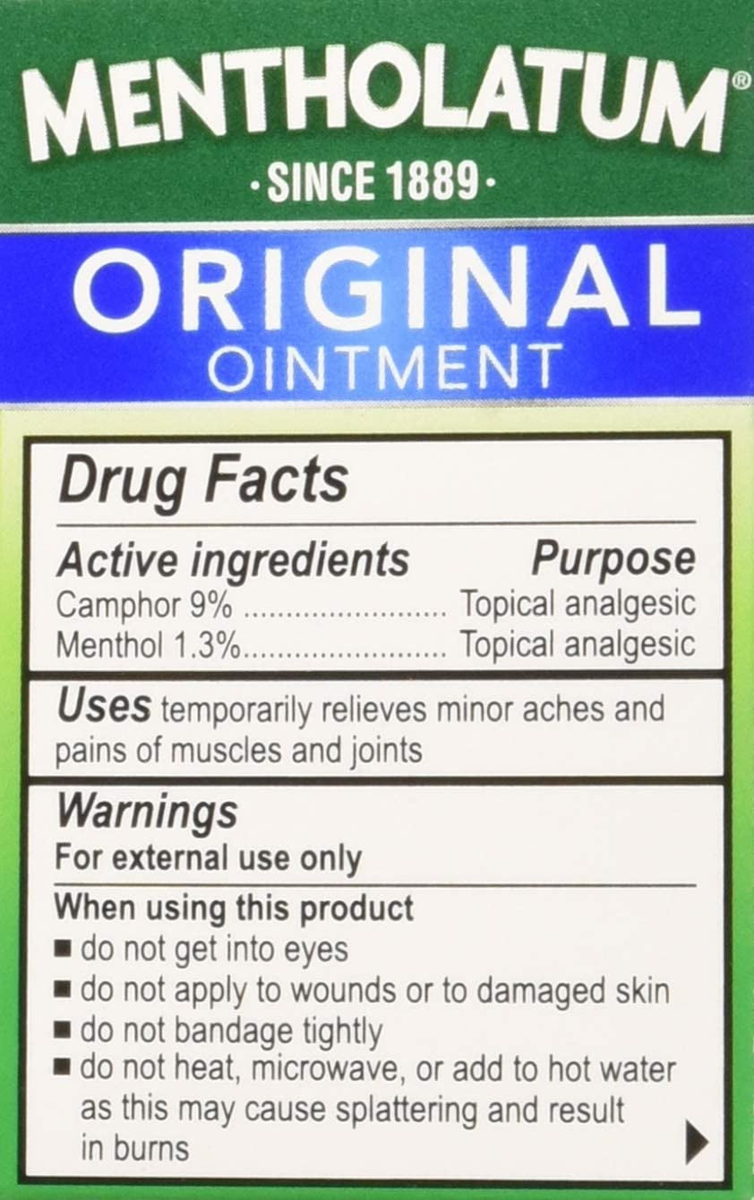 Gentle, soothing relief, trusted for generations!Topical AnalgesicMentholatumActive Ingredients:Camphor 9%; Menthol, Natural 1.3%Adults and children 2 years and over: Apply to affected area not more than 3 to 4 times daily. Children under 2 years: Ask a doctor.Inactive Ingredients:Fragrance; Petrolatum; Titanium DioxideUses:Temporarily relieves minor aches and pains of muscles and joints. Aromatic vapors.For external use only. When using this product: do not heat; do not microwave; do not add to hot water or any container where heating water. May cause splattering and result in burns; do not get into eyes; do not apply to wounds or to damaged skin; do not bandage tightly. Stop use and ask a doctor if: condition worsens; symptoms persist for more than 7 days or clear up and occur again within a few days. Keep out of reach of children. If swallowed, get medical help or contact a Poison Control Center right away.