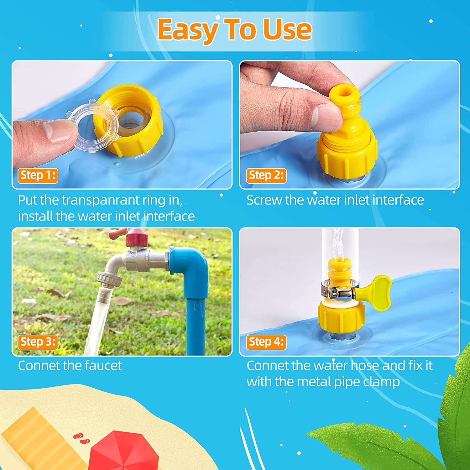 Our sprinkler and splash play mat is tested and certified. Made of thick non-toxic PVC material, no pungent plastic smell, BPA and phthalates free.