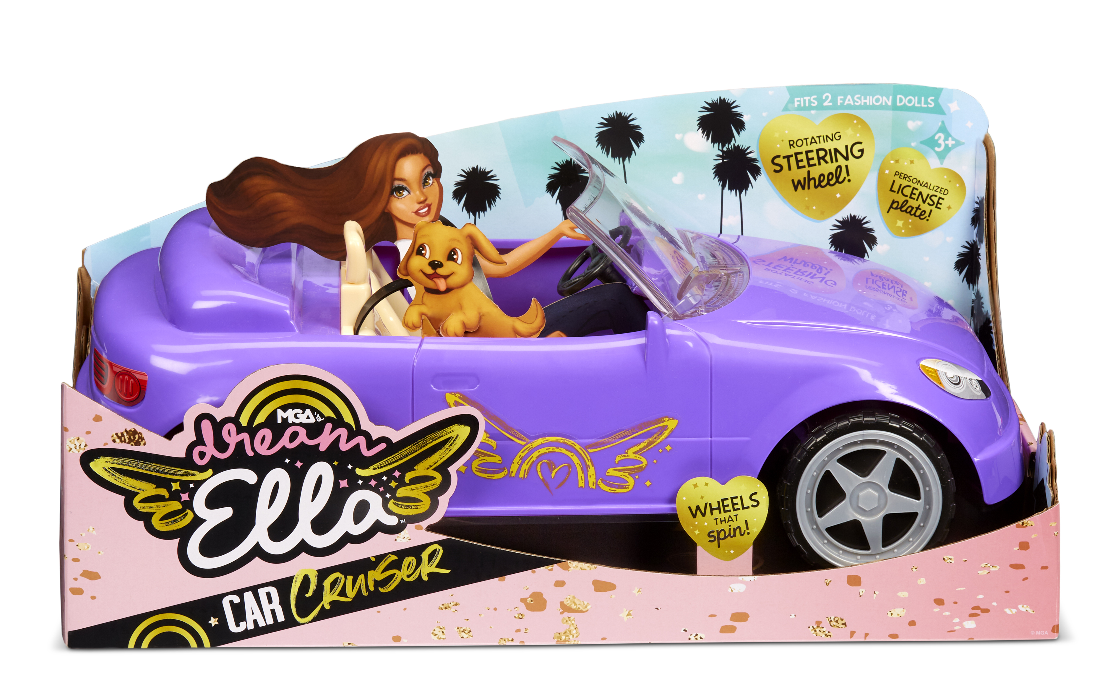 MGA’s Dream Ella inspires kids to be whoever and whatever they can imagine. Kids can create their own stories and role play between fantasy and reality. Dream Ella and her best friends use teamwork and their amazing real-life skills with an exciting, magical fairy twist. They keep everyone happy, healthy and safe! MGA’s Dream Ella Car Cruiser is the perfect car for your favorite fashion dolls! Ride in style with the sparkly purple car. The two-seater has realistic upholstery details, side view mirrors, and seats with seatbelts. Fits most 11.5" fashion dolls. Dolls not included. Great Gift for Children Ages 3 4 5+ Years Old. #BeWhateverYouDreamSTYLISH CONVERTIBLE: MGA’s Dream Ella Car Cruiser has a sparkly purple exterior and modern interior. The two-seater has an open roof, silvery rims and decal headlights.SEATBELTS FOR SAFETY: The car has realistic upholstery, side view mirrors and seats with seatbelts. Buckle up your favorite fashion dolls before starting the ride to the open road of imagination.MOVING WHEELS: The realistic wheels are ready to travel to the next destination. FITS 2 FASHION DOLLS: The two-seat car fits most 11.5" fashion dolls. Dolls not included. FOR KIDS AGES 3 AND UP: Perfect gift for kids ages 3 years old and up for young imaginative play.