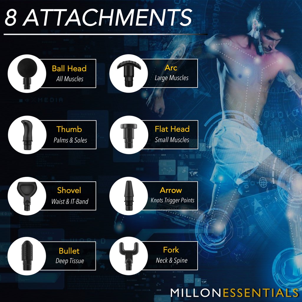 – Adaptable: Includes 8-interchangeable percussion massage heads corresponding to unique body parts.