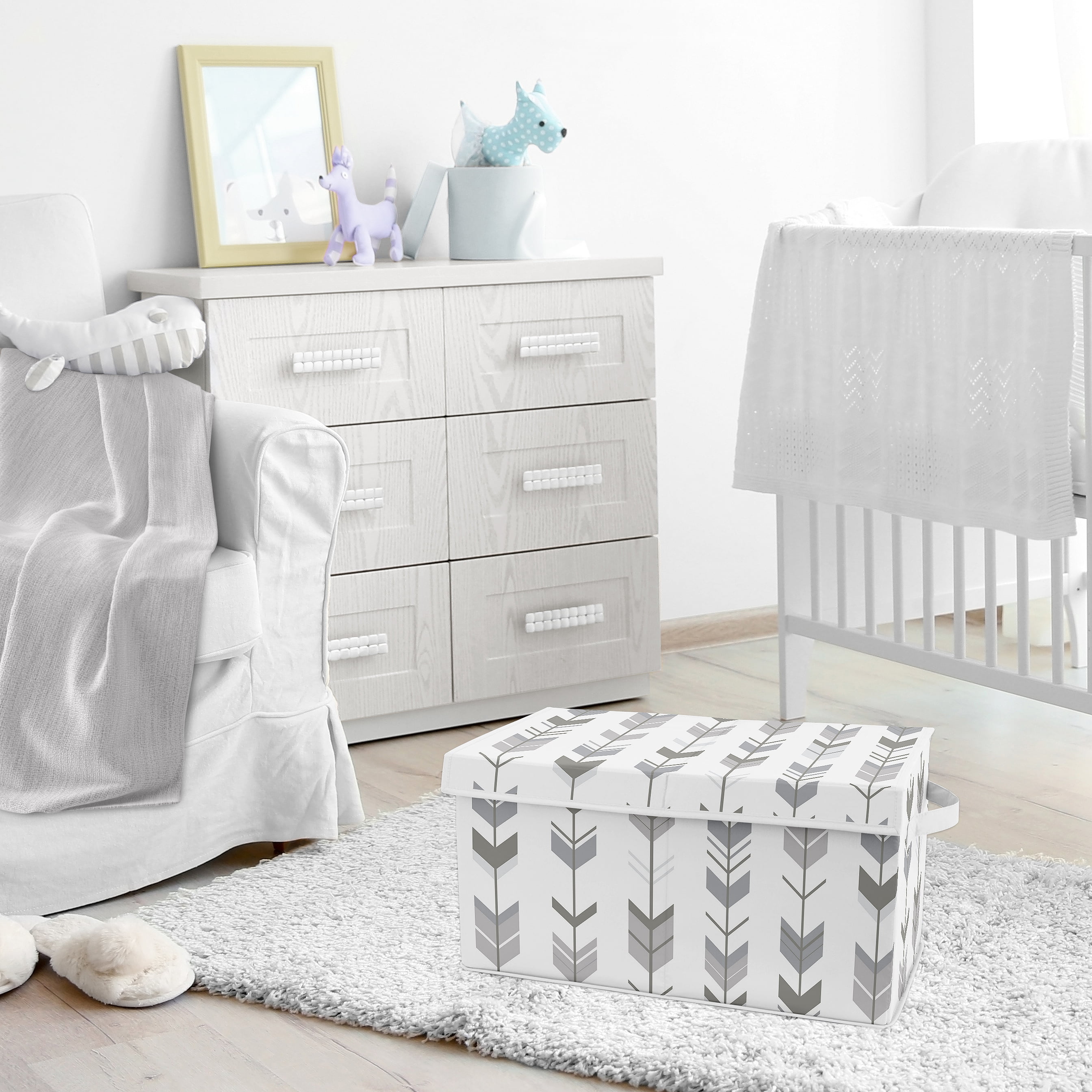 Sweet Jojo Designs fabric toy bins are perfect for storing and organizing unruly clutter in the nursery, playroom, classroom, office or bedroom. Each toy box features an attached flip lid to keep books, stuffed animals, craft supplies, clothing and other items out of sight and out of mind. It’s also the perfect alternative to boring clothing hampers and baskets. This kid friendly storage solution is collapsible to save space when not in use. Sweet Jojo Designs Grey Woodland Arrow Boy or Girl Small Fabric Toy Bin Storage Box Chest For Baby Nursery or Kids Room – Gray and White Mod Modern