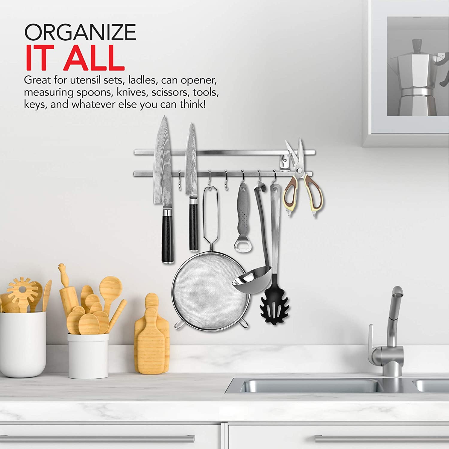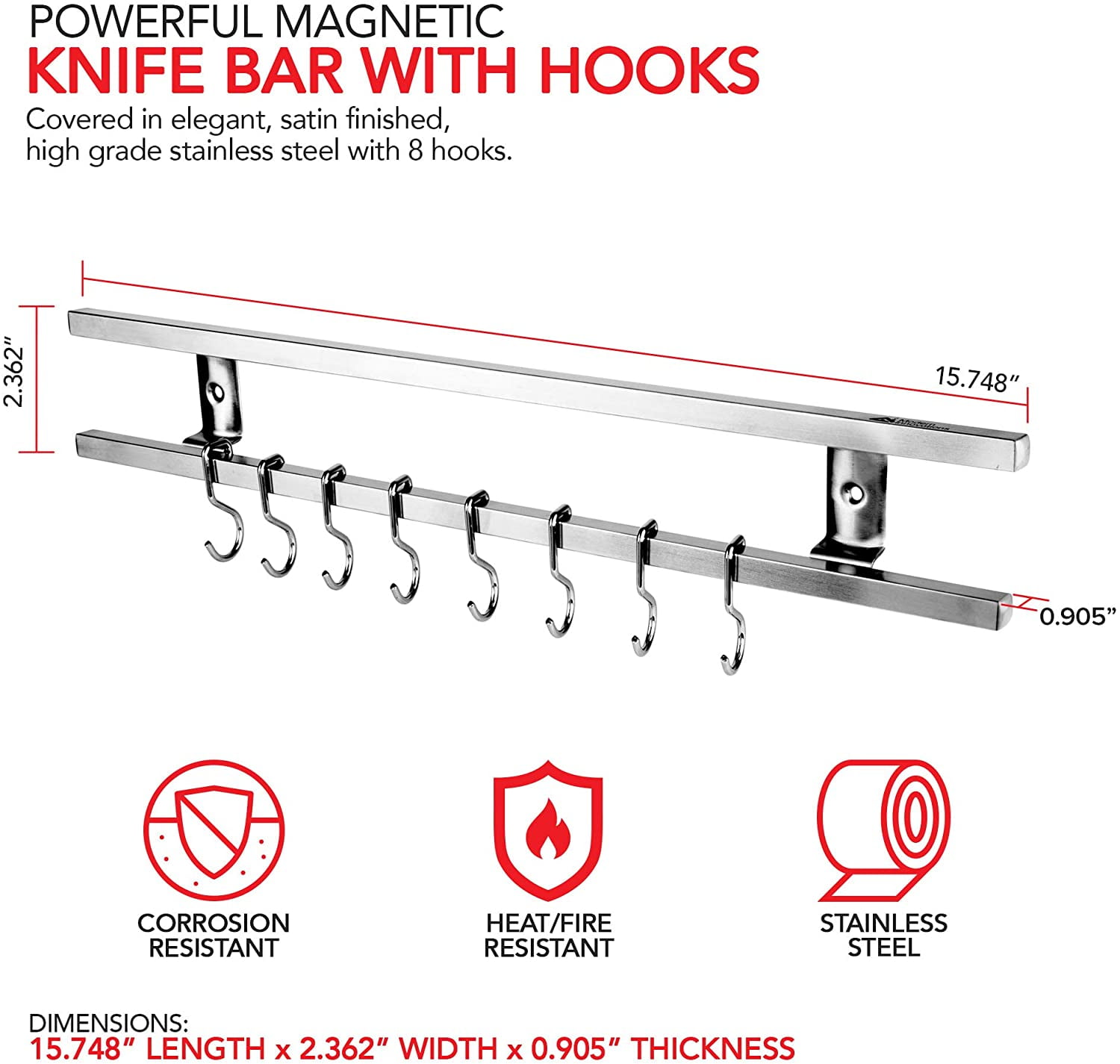 - POWERFUL MAGNETIC KNIFE BAR WITH HOOKS: Our 16” magnetic knife strip with hooks makes organizing your kitchen a breeze! We’ve designed our knife bar with 8 hooks for convenient access to your kitchen knives and utensils. Covered in elegant, satin finished, high grade stainless steel, our knife bar has a sophisticated look that effortlessly compliments your kitchen and home décor.