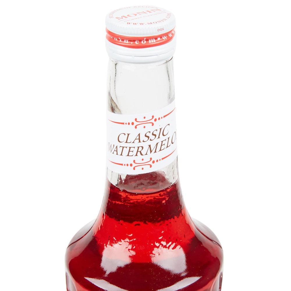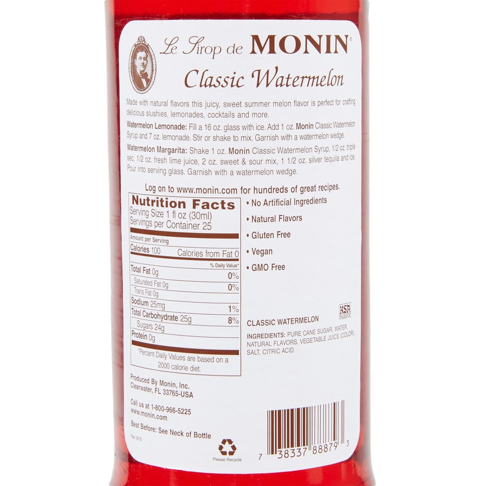 Monin Watermelon Syrup adds premium, sweet watermelon flavor to all your thirst-quenching beverages. Crafted with select all natural ingredients and pure cane sugar in a highly concentrated, authentic flavoring. Spruce up your smoothies, punches, margaritas, lemonade, iced teas, cocktail and mocktails. Monin products are gluten free, alcohol free, and GMO free. All Monin products are Kosher certified. Does not contain high fructose corn syrup.Monin Syrup – Watermelon – 750 ml