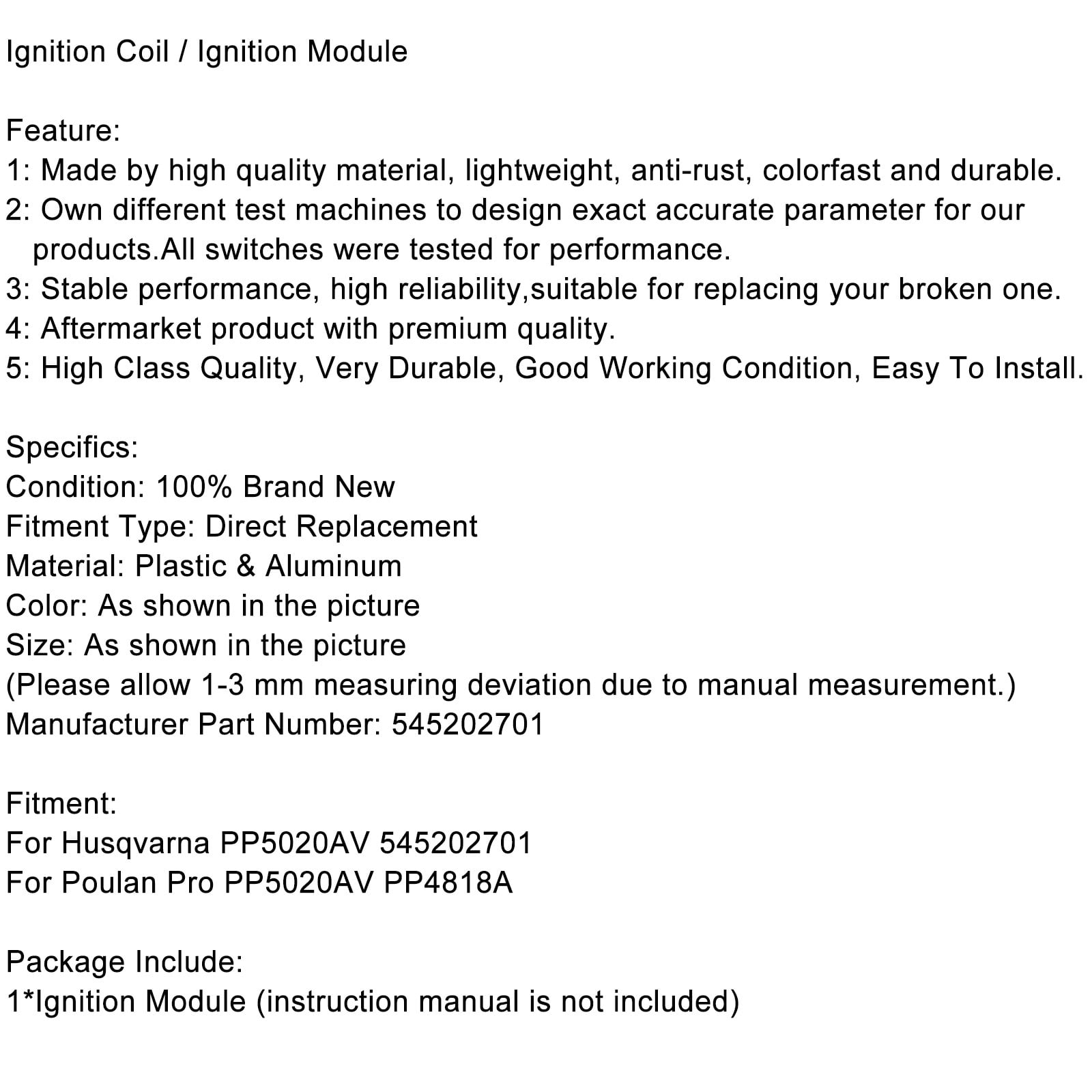 1*Ignition Module (instruction manual is not included)Motor Genic 545202701 Ignition Module Coil Fits For Poulan Pro PP5020AV PP4818A