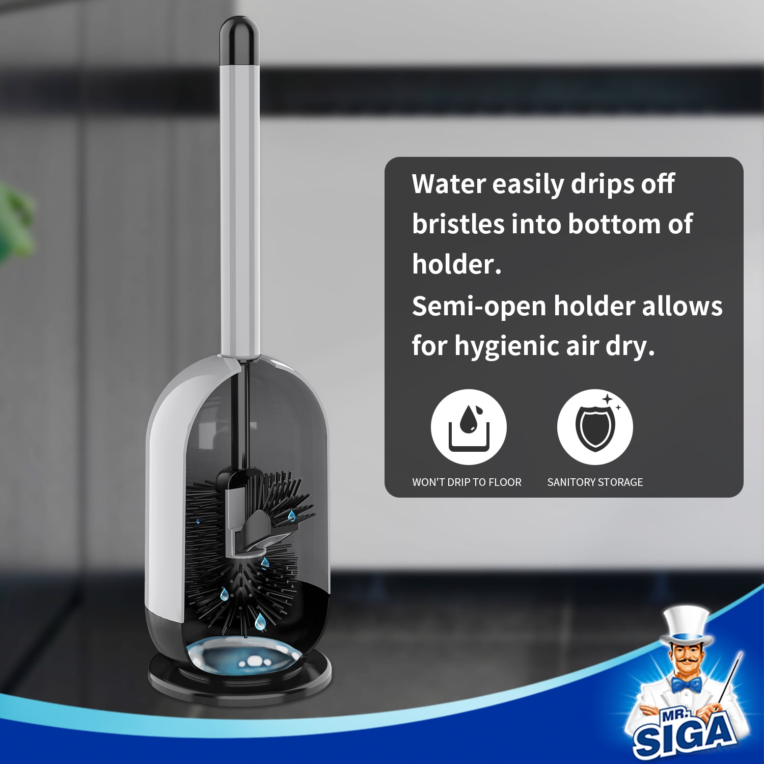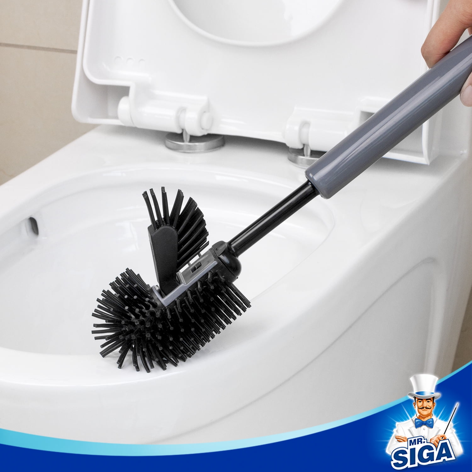 - NON-SCRATCH BRISTLES: MR.SIGA Soft Bristle Toilet Brush with Holder, Black,Soft Bristle fibers to remove dirt easier, Under-rim Brush, Brush holder. Durable and flexible TPR fibers create long-lasting bristles for strong cleaning ability but won’t scratch the toilet bowl, leaving your toilet bowl spotless and sanitary.