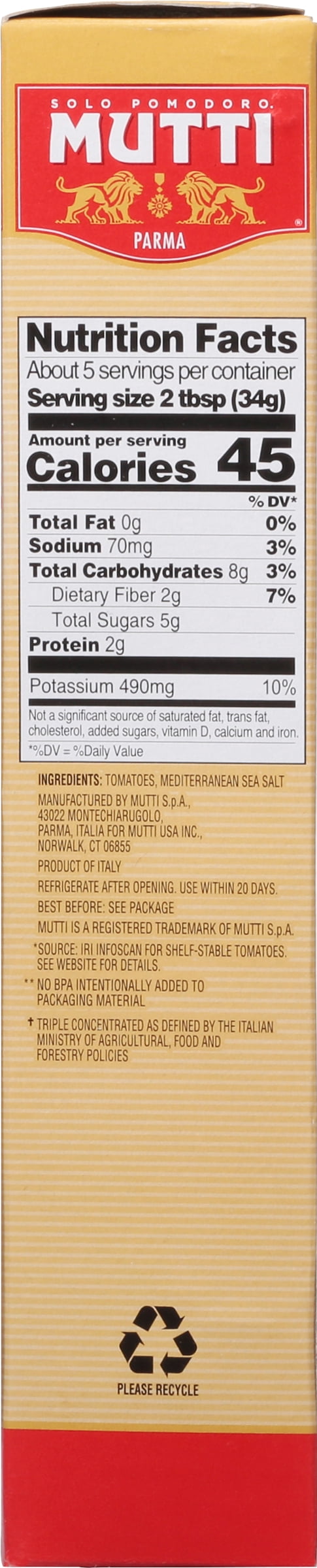 Mutti Tomato Paste Triple Concentrato is made entirely from Italian tomatoes local to the Parma region of Italy. Use Mutti Tomato Paste Triple Concentrato in soups, stews, or other dishes that have long cook times and need serious tomato flavor.