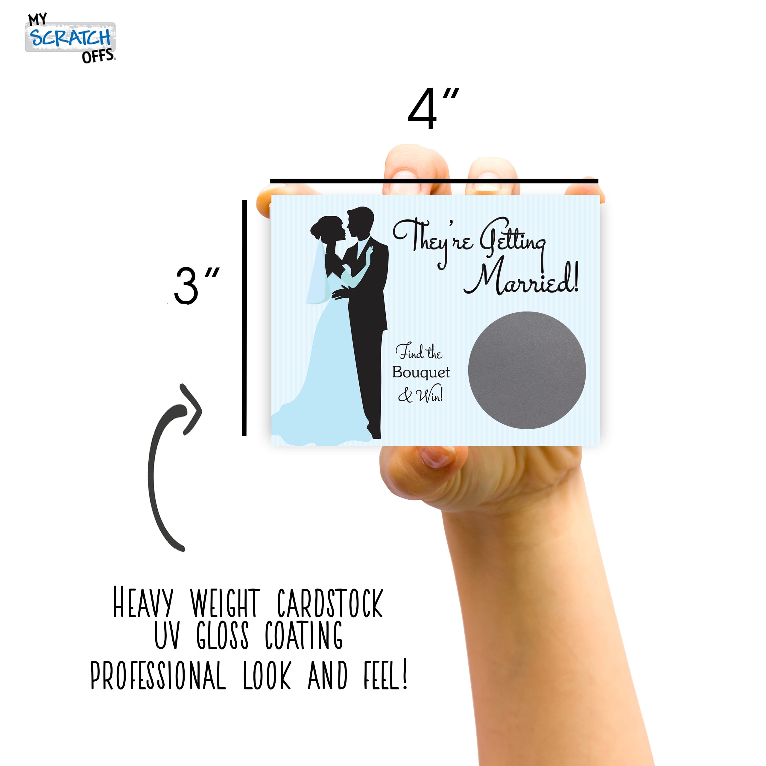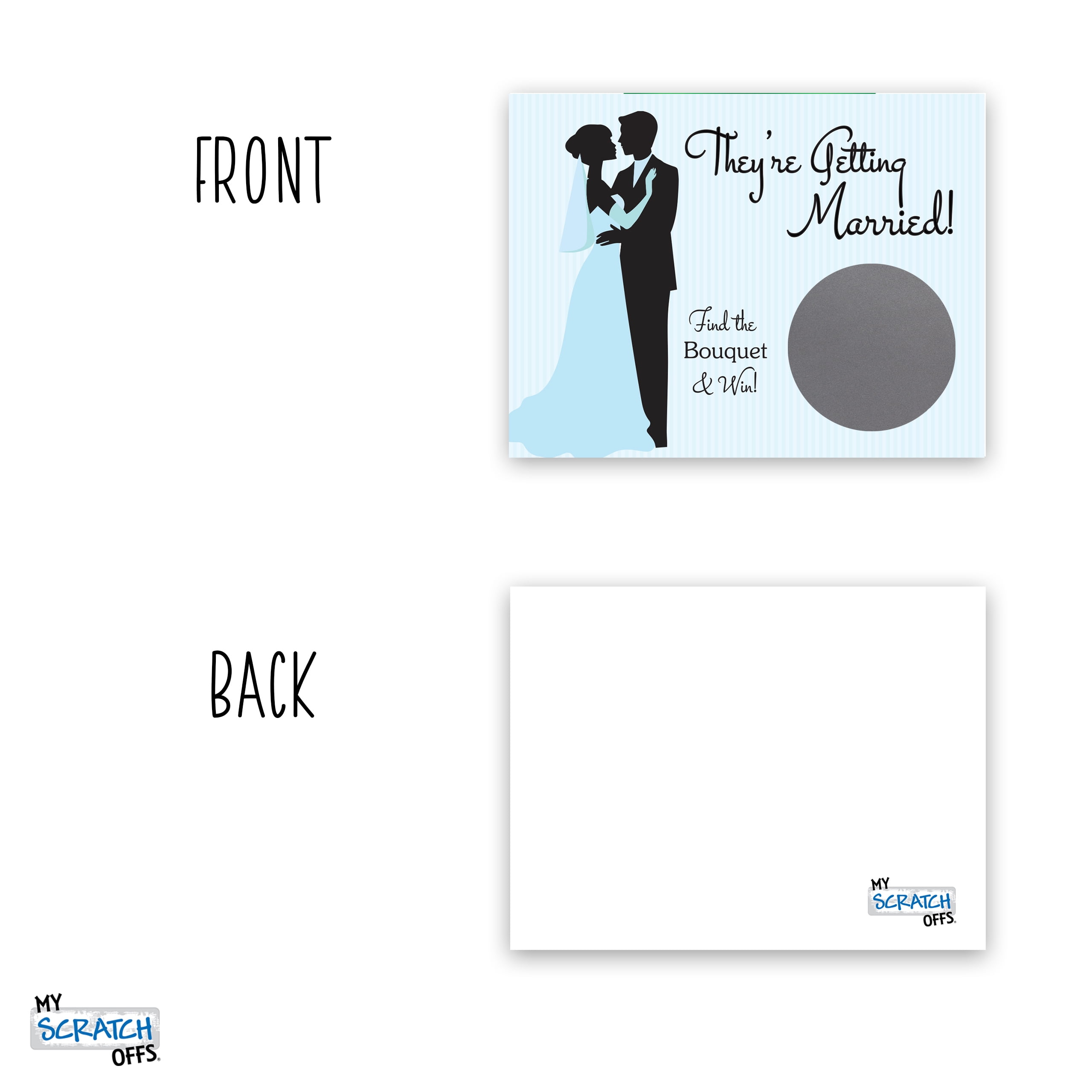 Bride &Groom Bridal Shower Scratch Off Game Card – Blue Pinstripe• Card features a Blue Pinstripe Bride &Groom Bridal Shower design and comes with one href="https://myscratchoffs.com/product/silver-1-5-round-scratch-off-labels/& 1.5” Silver Round & Scratch Off area.• Cards measure 3” x 4”• Sold in packs of 26 Cards with 24 cards and 2 Winner cards. Winning cards will be the top cards in the pack. • Professionally printed on Heavyweight Cardstock with Glossy UV coating• Ships within 1-2 business days; you will receive an email with tracking once shipped• Game Cards are pre-printed and are not customizable• Scratch Off Cards are designed by My Scratch Offs, LLC• Made in USA© 2022 My Scratch Offs, LLC