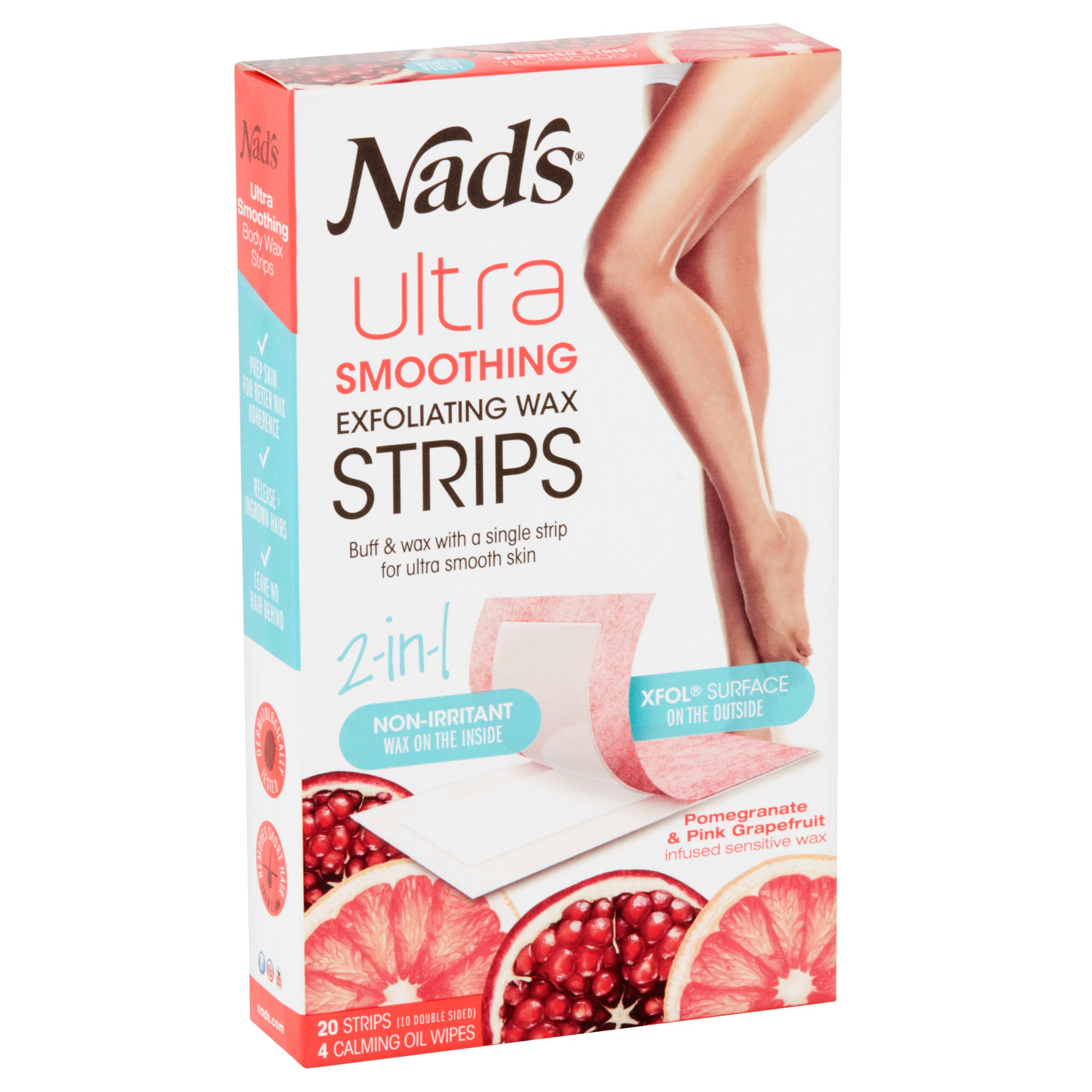 Each Ultra Smoothing Exfoliating Wax Strip features Nad?s patented Xfol technology, a coarse outer surface that buffs away the build up of dead skin and releases ingrown hair, allowing the premium wax to adhere to and remove even more hair, for the best hair removal results at home.Nad’s Exfoliating Body Wax Strips, 20 Count + 4 Post Wax Calming Oil Wipes