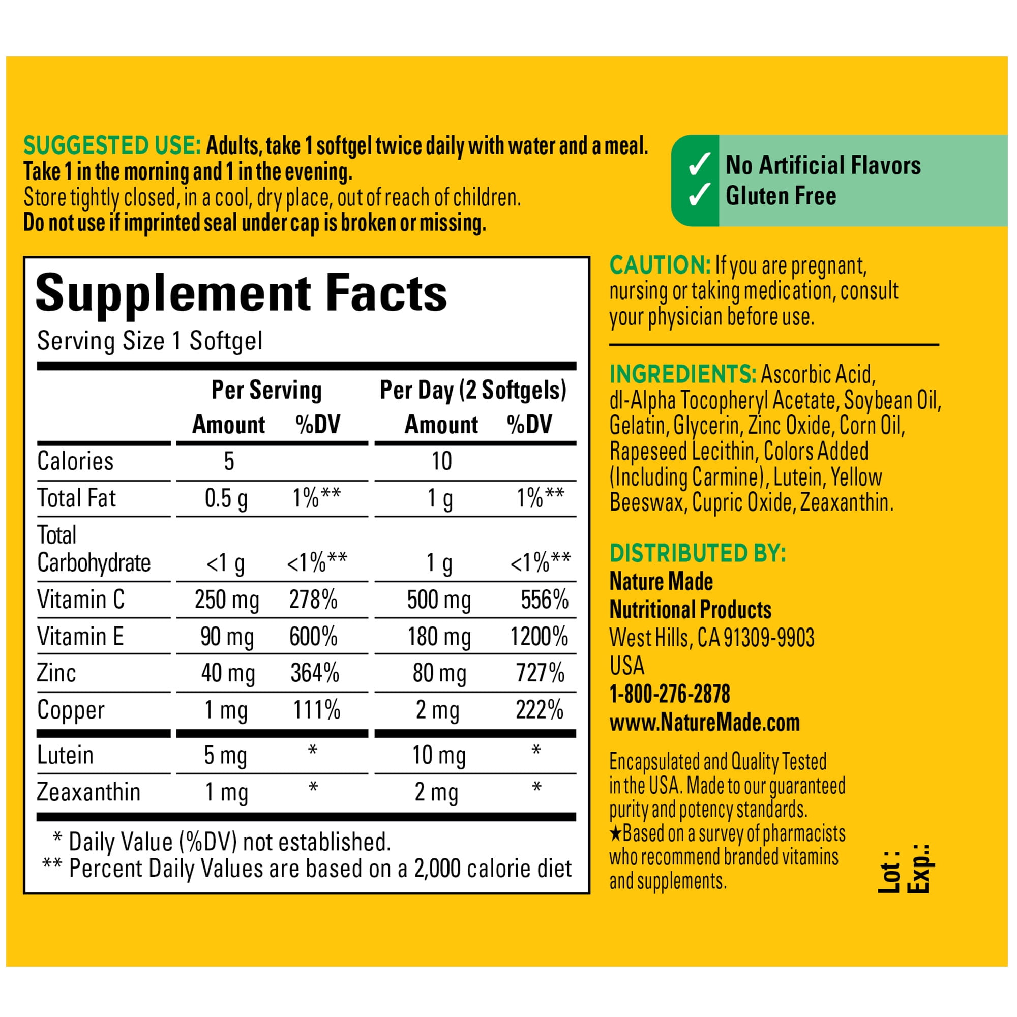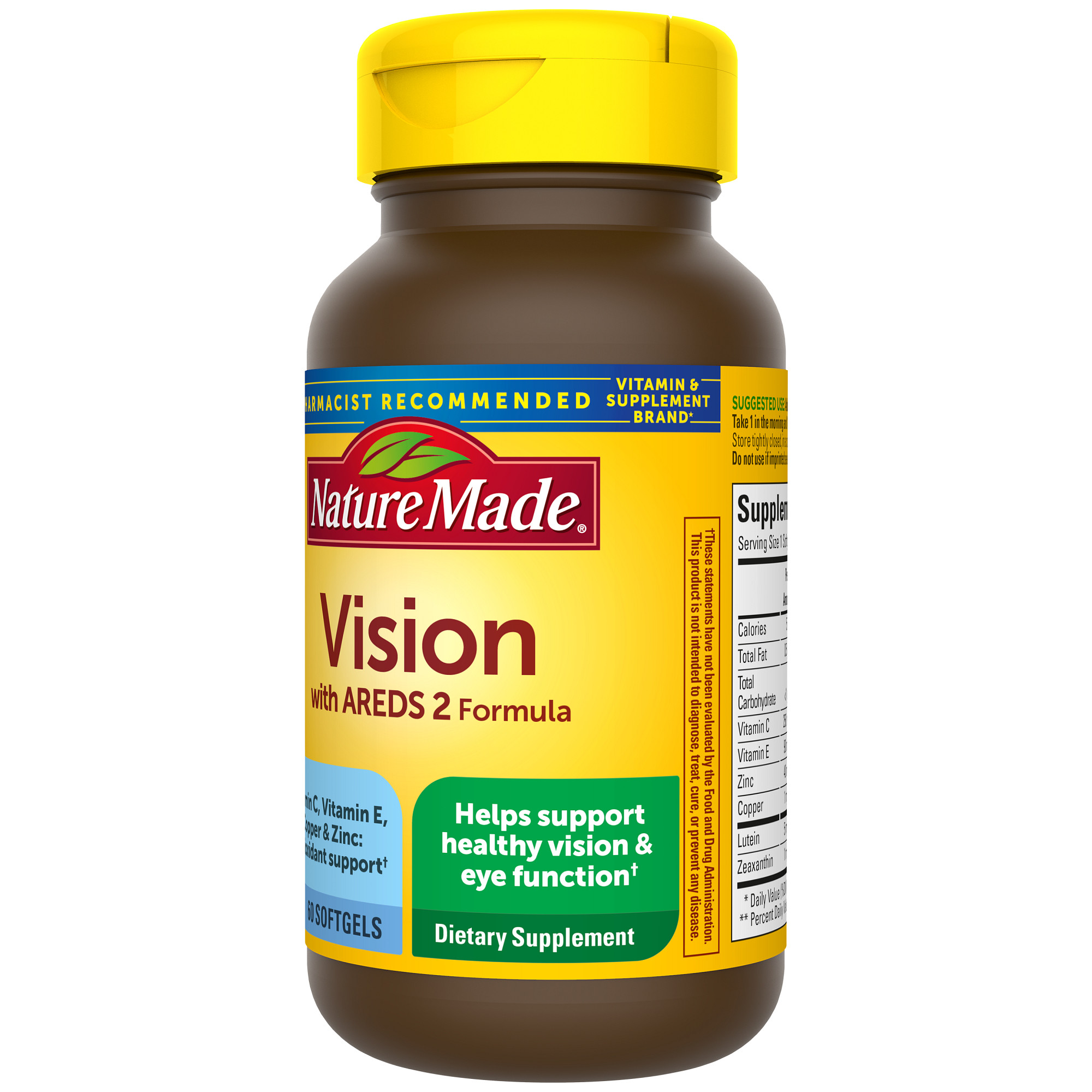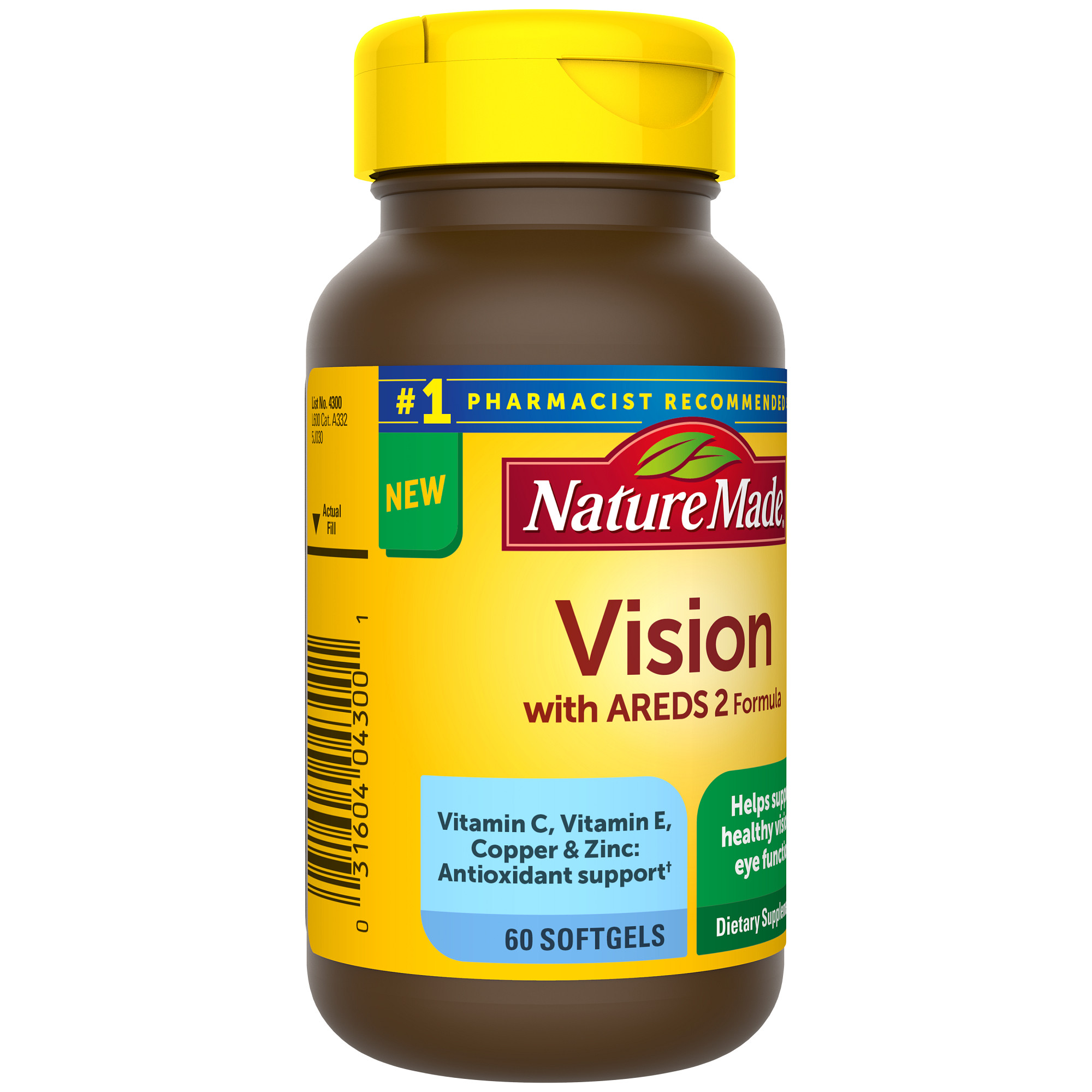 - QUALITY EYE VITAMINS & NUTRIENTS FROM A TRUSTED BRAND: Nature Made’s Vision with AREDS 2 Formula combines Vitamin C and Vitamin E, 2 eye vitamins, with Lutein & Zeaxanthin plus Zinc and Copper to help support healthy vision and eye function.