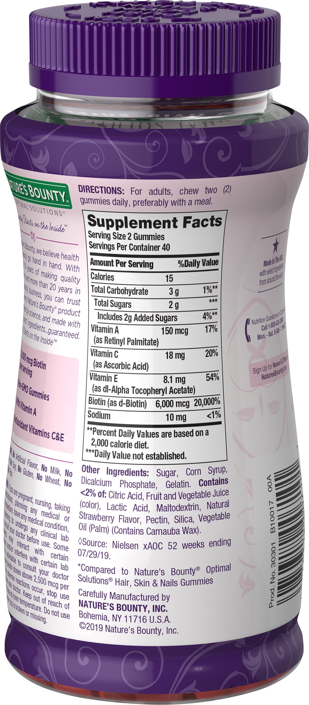 Nature’s Bounty® Advanced Hair Skin & Nails Gummies! Packed with 2x the amount of Biotin as our leading Hair, Skin & Nails gummy formula, each serving contains 6,000mcg of Biotin to support beautiful hair, glowing skin, and healthy nails.* These delicious strawberry flavored gummies are Non-GMO and now includes Vitamin A which plays an essential role in maintaining skin health.* Advanced Hair, Skin & Nails Gummies contain antioxidants Vitamin C and Vitamin E. Vitamin C is involved in the production and formation of collagen, acting as the basis for glowing skin, while Vitamin E is a nutrient that is found on the outermost skin surface.* The #1 Brand for Hair, Skin & Nails.◊ *These statements have not been evaluated by the Food and Drug Administration. This product is not intended to diagnose, treat, cure or prevent any disease. †Compared to Nature’s Bounty® Optimal Solutions Hair, Skin & Nails Gummies ♢Source: Nielsen xAOC 52 weeks ending 5/24/20