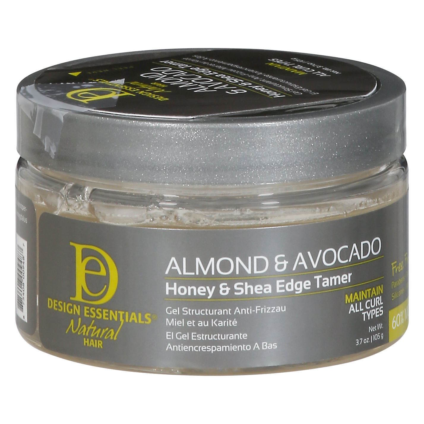 - Natural hair. Maintain all curl types. Design Essentials Almond & Avocado Honey & Shea Edge Tamer is a moisturizing, firm-hold edge control gel that provides brilliant shine and frights frizz. Enriched with nourishing honey and shea, it smooths and lays down the hairline without flaking and appearing dry. Ideal for ponytails, braids and any styling that requires smooth edges. Free from parabens, paraffins. silicones, mineral oil. 60% More. The McBride Guarantee: This product is guaranteed to meet McBride Research Laboratories quality performance standards or your money back. designessentials.com. Follow us (at)designessentials. Facebook. Instagram. YouTube. Your hair will love this. Cruelty free. Country of Origin: USA.