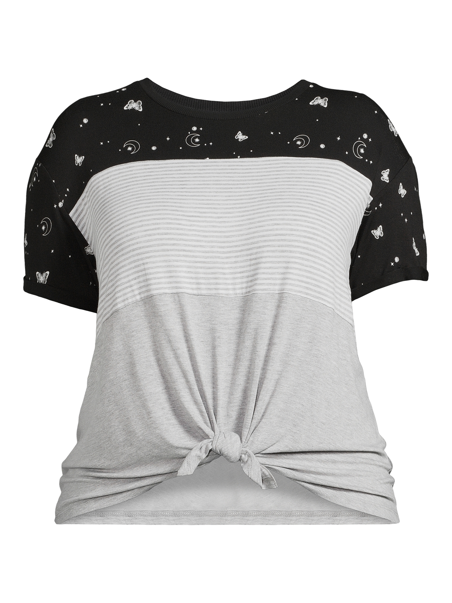 Cool, casual, comfortable. The three C’s of laid-back style are here with No Boundaries’ Triple Stack T-Shirt. Featuring a cuffed short sleeve, knot front, and a charming mix of solid and print, this easy pullover will be your new favorite. Super soft, with a touch of stretch for an incredible fit and feel. Exclusively at Walmart.