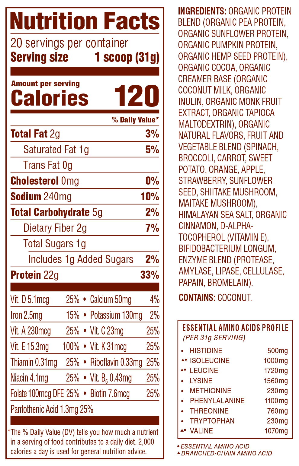 Nutiva Organic Plant Protein for Shakes and Smoothies is non-GMO, vegan, soy-free, gluten-free supplying many of the dietary components vital for good health and comes in two delicious flavors, chocolate and vanilla, and is a wholesome addition to premium diets like vegetarian, vegan, whole food, and more. Each serving is rich in protein with 23g for vanilla and 22g for chocolate as well as 31g of amino acids, 1 billion colony forming units (CFUs) of probiotics and 25% Daily Value of 12 essential vitamins. Unlike other protein powders on the market, Nutiva Plant Protein is never processed with hexane or other dangerous chemicals. At Nutiva, we start with organic, non-GMO, sustainably grown and responsibly harvested pea, sunflower, pumpkin, and hemp as the base for our soy-free protein powder. This all-natural high protein base is blended with fruits and vegetable including spinach, broccoli, carrot, beet, shitake mushroom, apple, cranberry, cherry, and cinnamon and naturally sweetened with monk fruit. Nutiva was founded in 1999 with a single purpose in mind – to Revolutionize the Way the World Eats. We produce organic, nutrient-dense foods that are good for you and good for the planet. Social and environmental responsibility is a core part of Nutiva’s culture and business. We are dedicated to sourcing organic products, obtaining fair trade certification, greening our facilities and operations, and funding tree planting at schools in our local community; we are constantly seeking ways to better protect our environment and ensure a better quality of life for employees, customers, and the communities we serve.