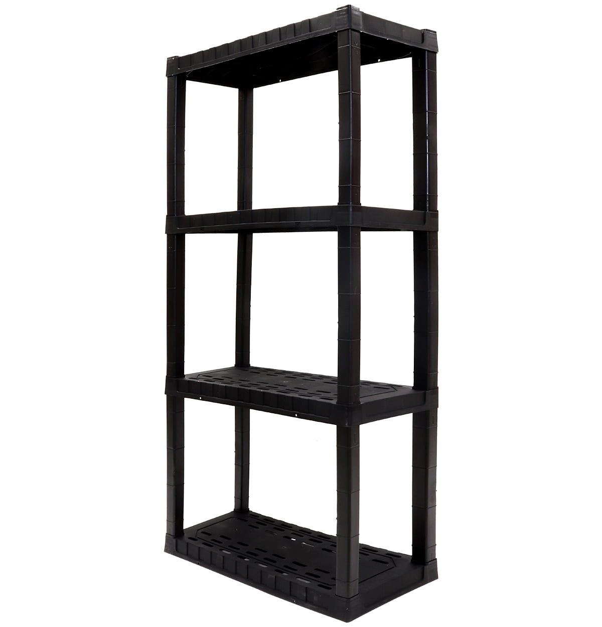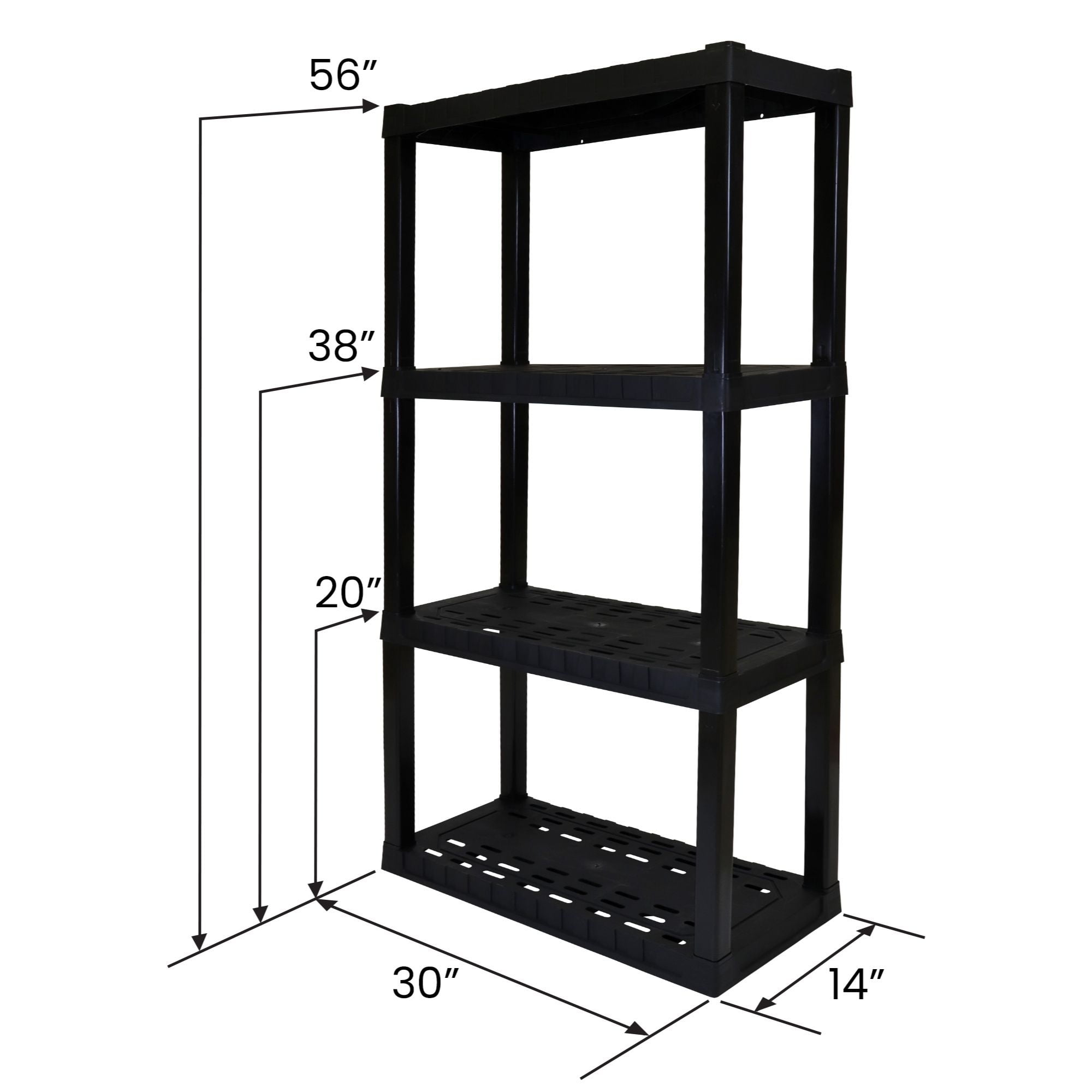 Adding shelving is one of the simplest ways to organize even the most limited spaces, protect your items from damp floors, and more. Maximize your storage space with this versatile 4 tier shelving unit, proudly manufactured in North America by Koolatron. This lightweight unit snaps together with no tools required and can be assembled and moved by just one person so you can get started on your home organization project right away. Heavy-duty molded plastic resin shelves hold up to 100 lbs (45 kg) each for a total storage capacity of 400 lbs and will not rust, dent, stain, or peel. Nested legs and anchor holes offer added support and security and ventilation holes in the shelves allow air to flow freely around your items for low-maintenance long-term storage. Whether you are decluttering your basement, organizing your craft room, or spring cleaning your garage, Oskar has the perfect shelving solution for you.