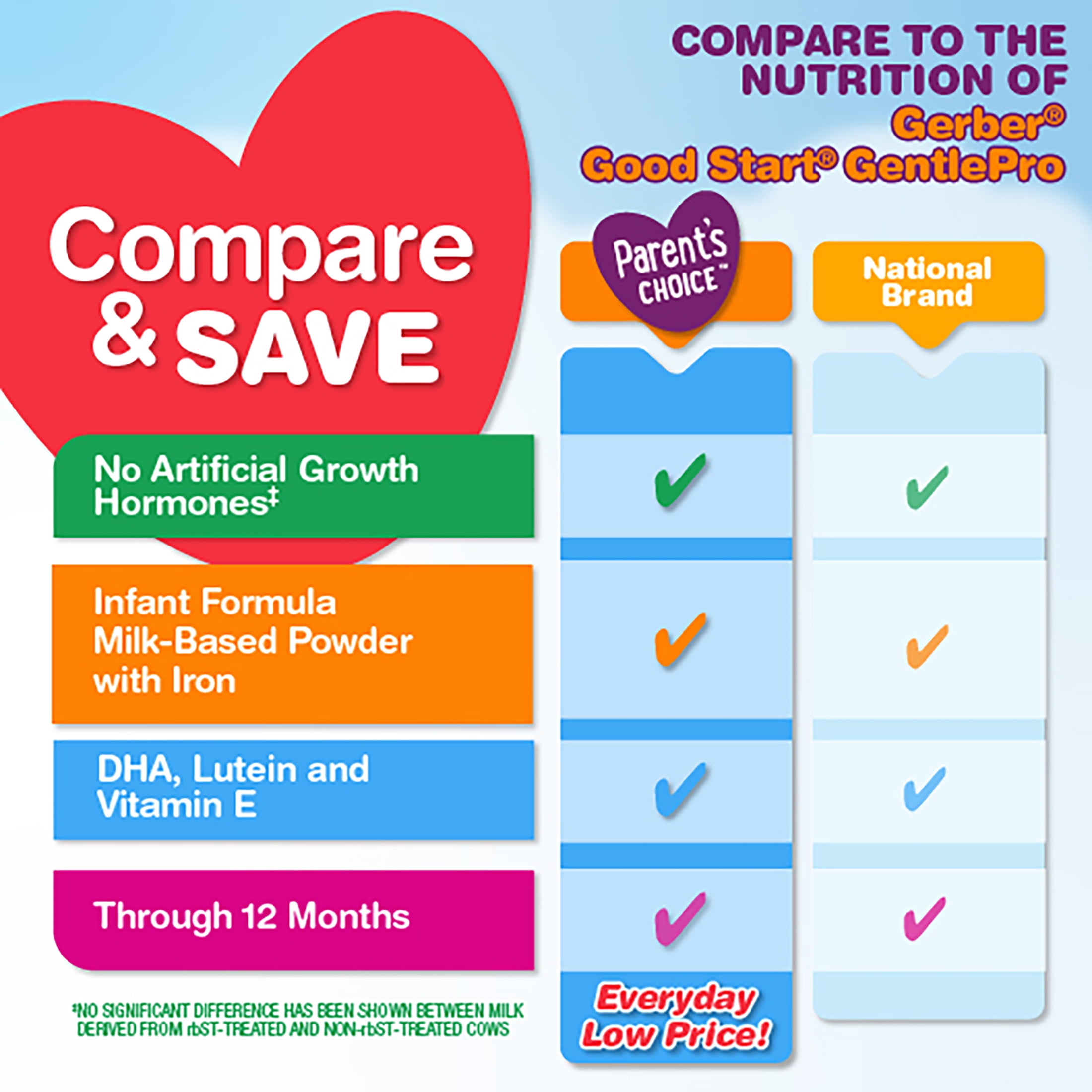 Compare to the Nutrition of Gerber® GOOD START® Gentle Tender® Non-GMO* Infant Formula (0-12 months) contains easy-to-digest proteins for tiny tummies. Modeled after the complete nutrition of breast milk, our Tender baby formula contains prebiotics for immune support and DHA for brain development. This infant formula is also Non- GMO; its ingredients have not been genetically engineered. Tender also does not contain artificial growth hormones. This Infant formula is gluten free and certified Kosher by the Orthodox Unition?(U)D.
